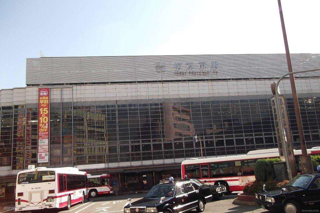 枚方市駅(ひらかたしえき)は、大阪府枚方市岡東町にある、京阪電気鉄道の駅。快速特急「洛楽」を除いた全種別が停車する。1910年(明治43年)の開業当時は、枚方宿の大阪側にある現・枚方公園駅が枚方駅を名乗り、当駅は枚方東口駅であった。その後、当駅が枚方市の中心駅となったことから、1949年(昭和24年)に改称された。この際、旧枚方駅との混同を避ける目的もあって枚方市駅となる。京阪電気鉄道が現在営業している「〜市駅」のなかで最も歴史が古い。なお、京阪における「〜市駅」の第一号は、会社分離前の新京阪線(現在の阪急京都本線)高槻市駅である。1939年(昭和14年)3月1日午後2時45分、大阪陸軍兵器支廠禁野倉庫第15番倉庫にて弾体から信管を取り外す作業中に爆発が発生。折からの強風に煽られ3時29分、砲弾・炸薬に引火誘爆した。半径2 km に弾丸や破片が飛び散る大爆発で消火活動も行えない状態が3日間も続き、降り注いだ砲弾の破片などで送電線・電車線・電気供給施設が損壊。同月4日午後8時に運転再開するも、駅の再開は6日までずれ込んだ。太平洋戦争後には乗降客数の増加がみられ、1955年(昭和30年)に18383人/日であったのが、1959年(昭和34年)には29344人/日へと約60%増加した。その後1960 – 1970年代は香里団地を始めとする宅地開発により、乗降客数は急増していった。また自動車の普及や列車本数の増加により、駅周辺の開かずの踏切問題が表面化したため、駅の高架化(連続立体交差事業)が計画された。駅の高架化事業は1978年(昭和53年)12月に着工、1988年(昭和63年)5月に上り線(京都行き)高架化。続いて1990年(平成2年)3月に下り線(大阪行き)が、1991年(平成3年)6月に交野線が単線高架化、1992年(平成4年)11月に複線高架化。以後も付帯工事を続け、1993年(平成5年)3月25日に高架化工事は竣工した。1980年(昭和55年)2月20日夜、当駅と御殿山駅の間の通称「磯島曲線」で発生した京阪電車置石脱線事故では、復旧に翌21日の午後までかかり、復旧まで淀屋橋駅 - 当駅間で折り返し運転を行い、特急は21日始発より運休した。運休中は樟葉駅と当駅の間で、バスによる振替輸送が行われた。1997年(平成9年)には朝ラッシュ時の下り特急が、また2003年(平成15年)には全ての特急列車が当駅に停車するようになり、利便性が向上した。