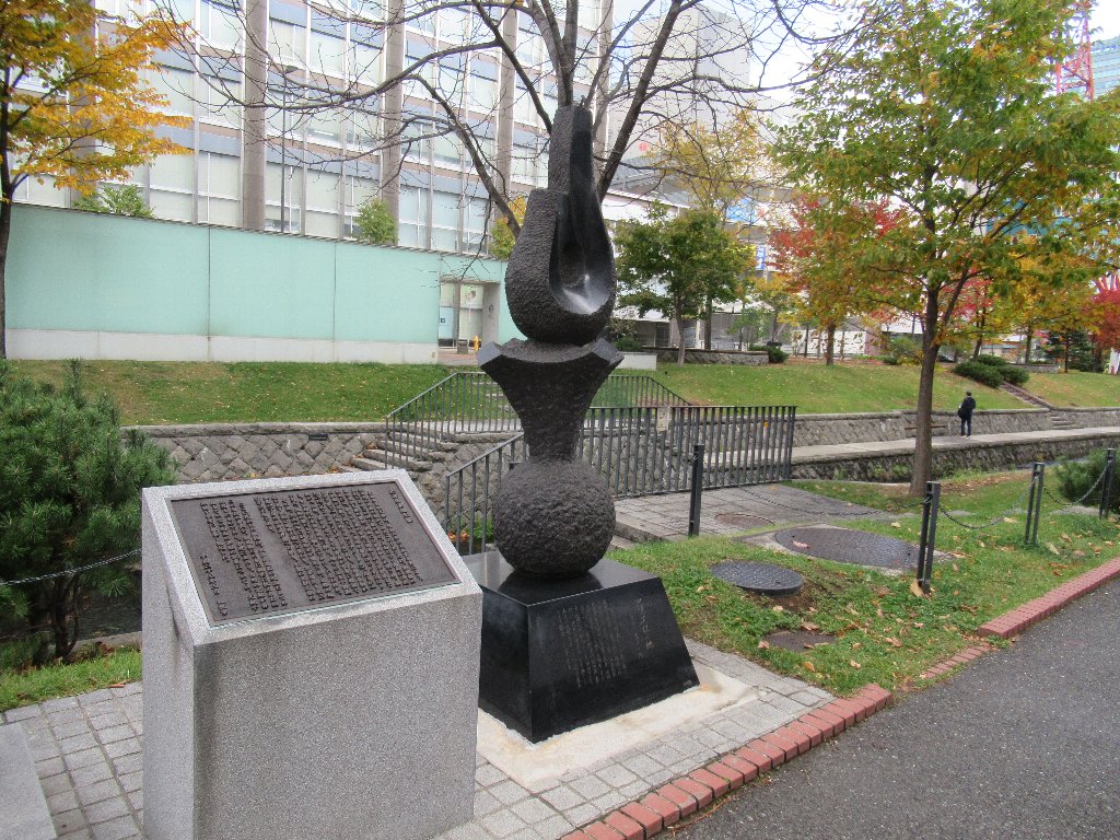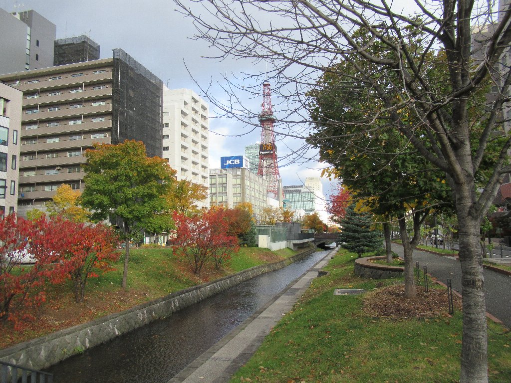 創成川は札幌の水運に利するために作られた人工河川、つまり堀なんですかな。きっちりと整備されて一部は親水公園になっていたりしますな。あちこちに碑や像、広場や北海道里程元標がございまして、歴史を感じさせてくれています。色々植樹されていて、本日も紅葉が見事でございますな。若かりし頃の京都で付近にこのような場所があれば定番のデートコースでしたな。いまでこそ堀川って親水公園化されてるけど、あの頃はドブ川の水流なしでしたからねえ。