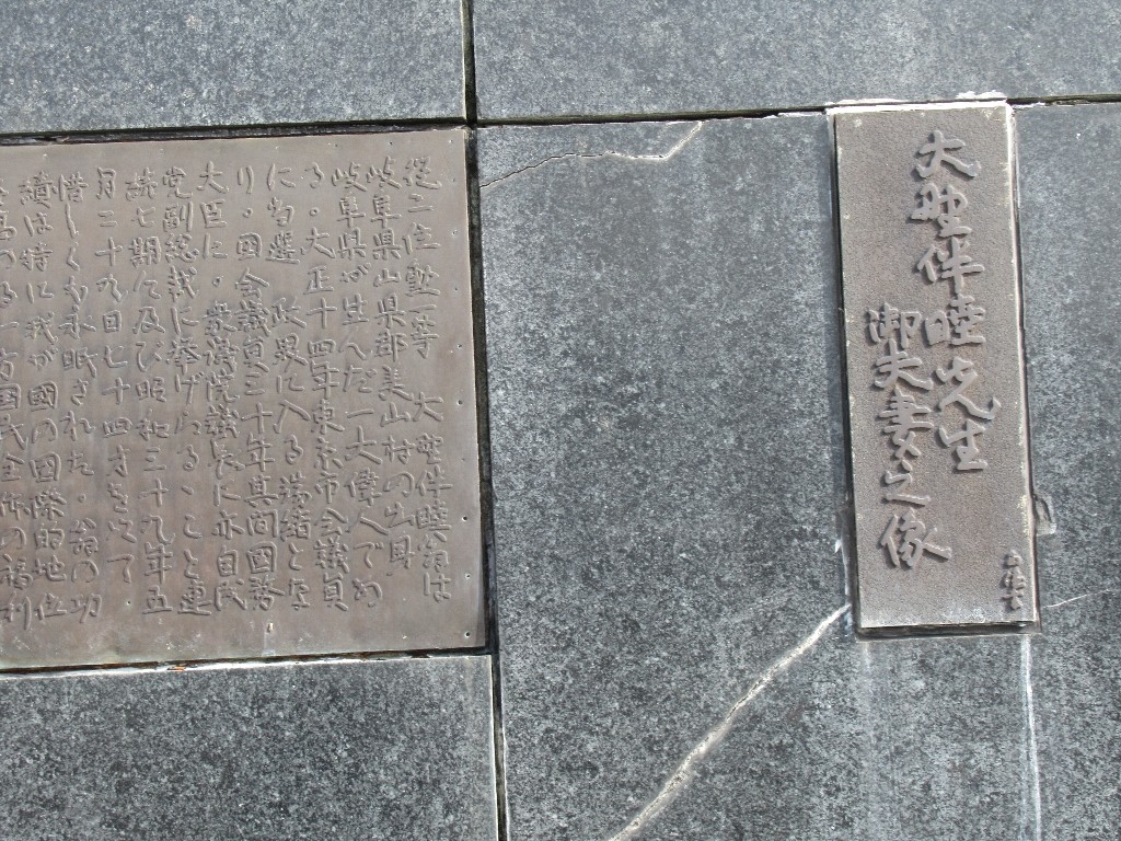 DoraNeko岐阜羽島駅前にある大野伴睦夫妻像でございます。岐阜羽島駅が設置されたのは大野伴睦の圧力であるとする所謂政治駅って話は誤りである、とされるようになりましたが、この像がここに建立されたことも、ほら見ろ政治駅だ、と言われた要因でございましょうね。東京オリンピックに間に合わせるのが世界銀行の融資条件で、関ヶ原の豪雪対策でここに規模の大きな駅機能を設けるしかなかったというのが真相、ってのが今では定説ですが。昭和の政治家の像が駅前に建立されるってのは全国的にも珍しいことなのでございます。ややこしいことしましたなw 現在では区画整理で公園とか整備されたんで目立ちませんが、以前はコレしかなかったみたいなんで余計に目立ったらしいですな。