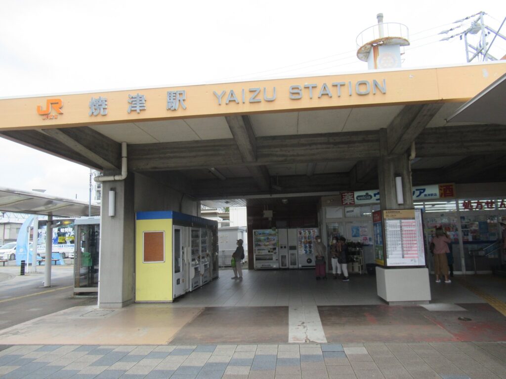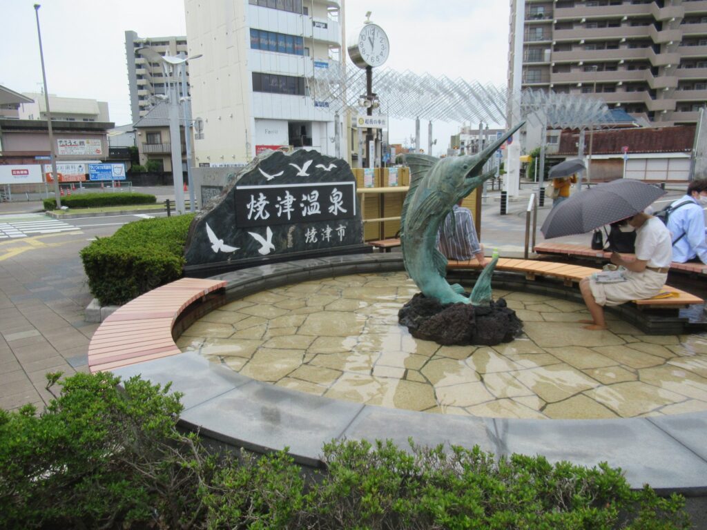 DoraNeko東海道本線の焼津駅でございます。広い構内に多数の側線があり、中ほどに島式ホーム1面2線がございます。約30年ほど以前まで数々の貨物取り扱いがあり、多数の専用線が存在した名残でございますね。廃車になった電気機関車と客車を使ったビアステーション焼津があったことで有名でしたが、それも廃止されて30年ほど経過してしまいましたですな。駅南口には様々なモニュメントや足湯がございます。