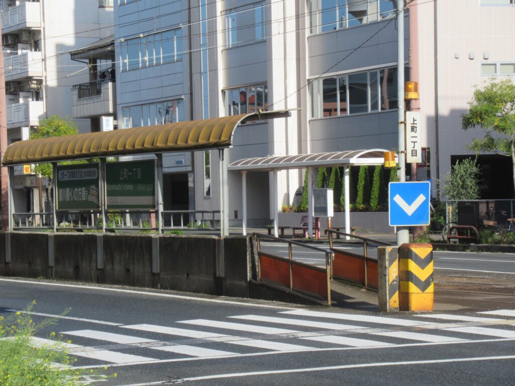 DoraNekoとさでん交通の上町一丁目停留場でございます。併用軌道上にある、交差点を挟んで千鳥式に配置されている相対式2面2線の停留場でございます。副名称として坂本龍馬誕生地前が付けられております。電車通りの南側裏手に高知市立龍馬の生まれたまち記念館がございます。