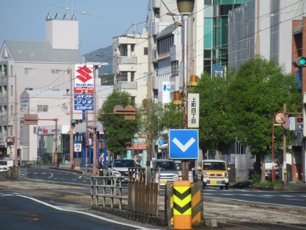 DoraNekoとさでん交通の上町四丁目停留場でございます。併用軌道上にある、交差点を挟んで千鳥式に配置されている相対式2面2線の停留場でございます。上町一丁目から上町五丁目まである停留場名ですが、三丁目だけがございません。元々はこの上町四丁目停留場と上町二丁目停留場の間に三丁目も存在していましたが、三丁目はこの上町四丁目停留場と統合される形で、三丁目と五丁目の間に移設して四丁目の名称が残されて今に至るのだそうです。