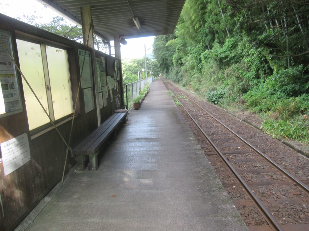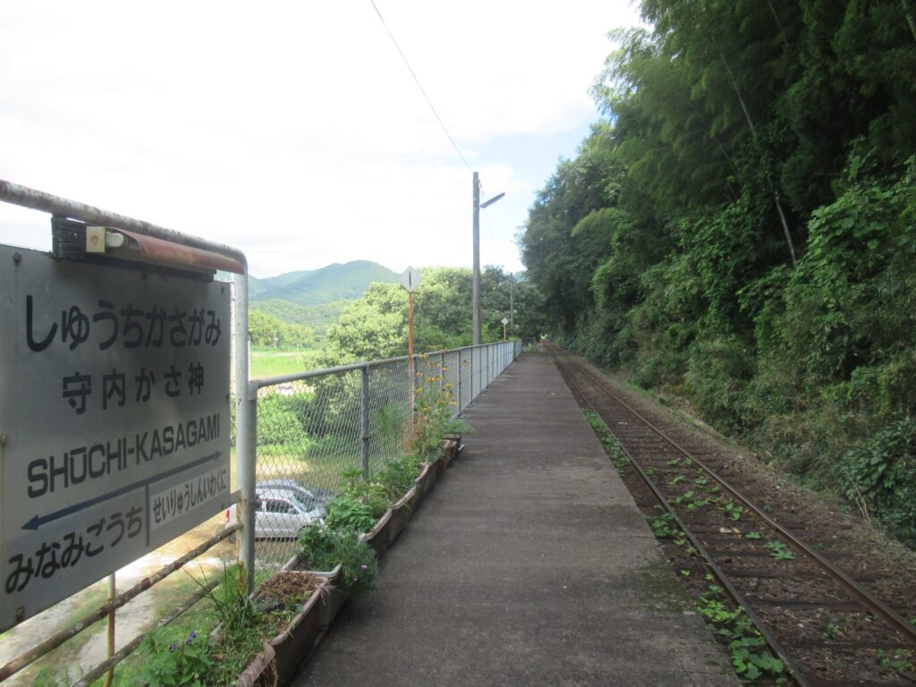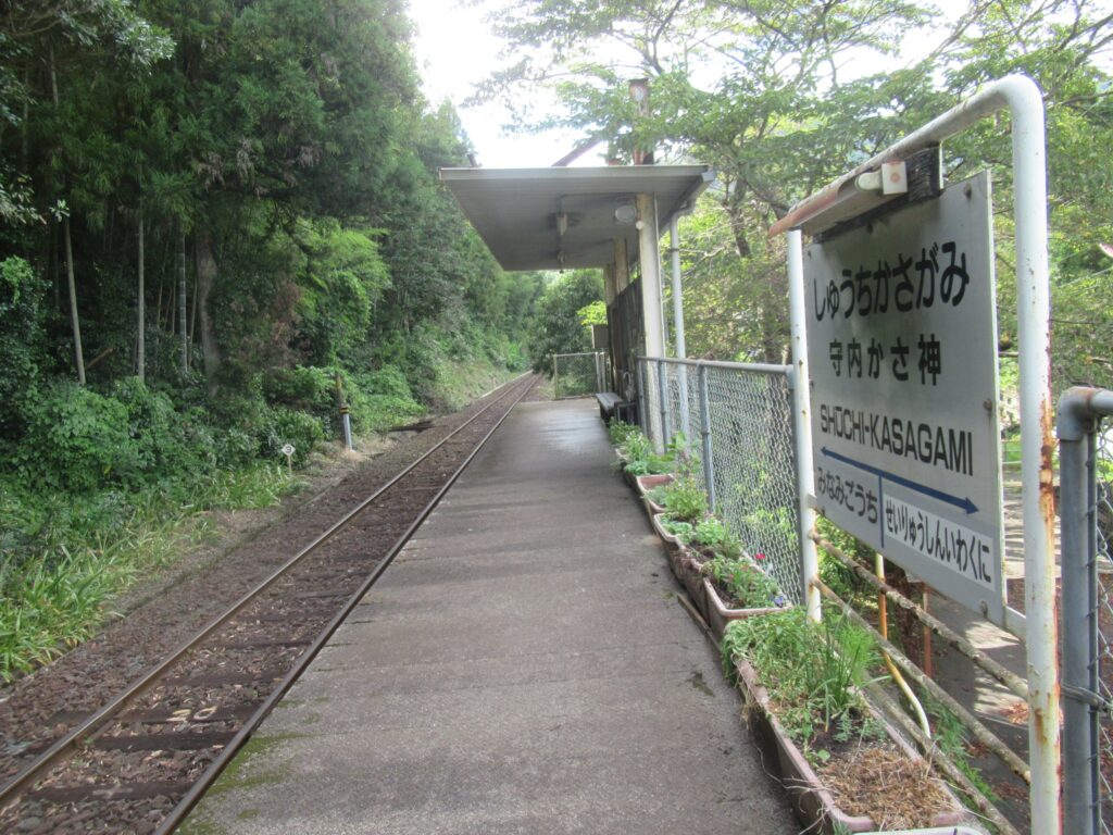 DoraNeko錦川鉄道錦川清流線の守内かさ神駅でございます。斜面上の盛土部に敷設されている単線区間にある地上駅で、単式1面1線の棒線駅となっております。駅舎のない無人駅で、高い位置にあるため地上部から階段でホーム先端に直接出入りする構造でございます。ホーム上に待合所が設置されております。1993年(平成5年)に追加設置された駅でございます。
