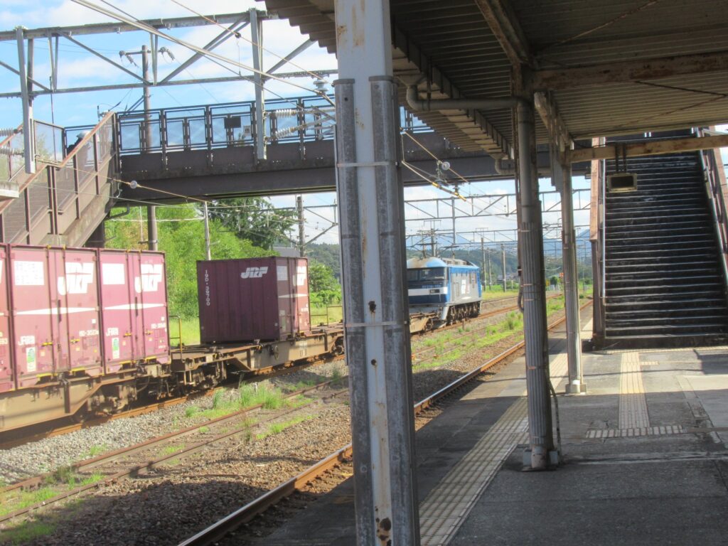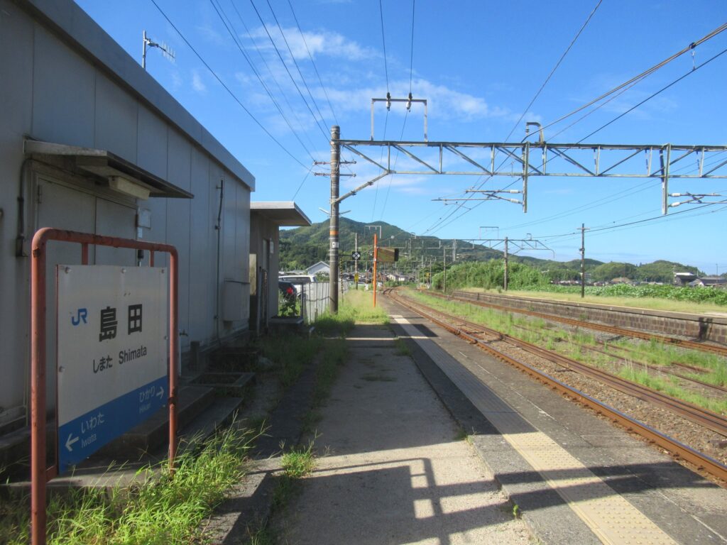 DoraNeko山陽本線の島田駅でございます。複線区間にある地上駅で、相対式2面2線に加えて架線のない中線が1線ある駅でございます。大き目のプレハブ駅舎がある無人駅で、ホーム間は跨線橋で連絡しております。駅は島田川沿いに位置しております。