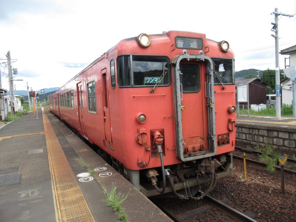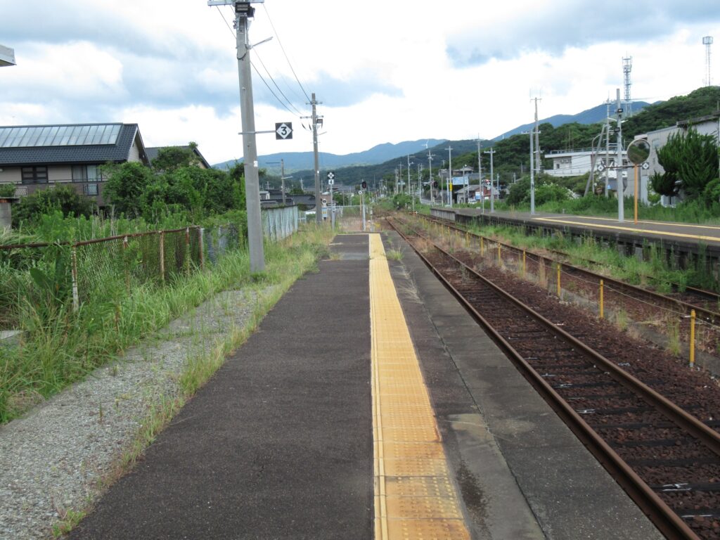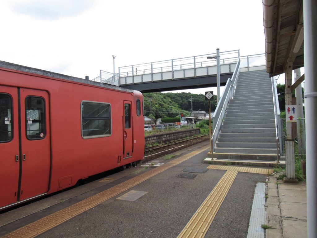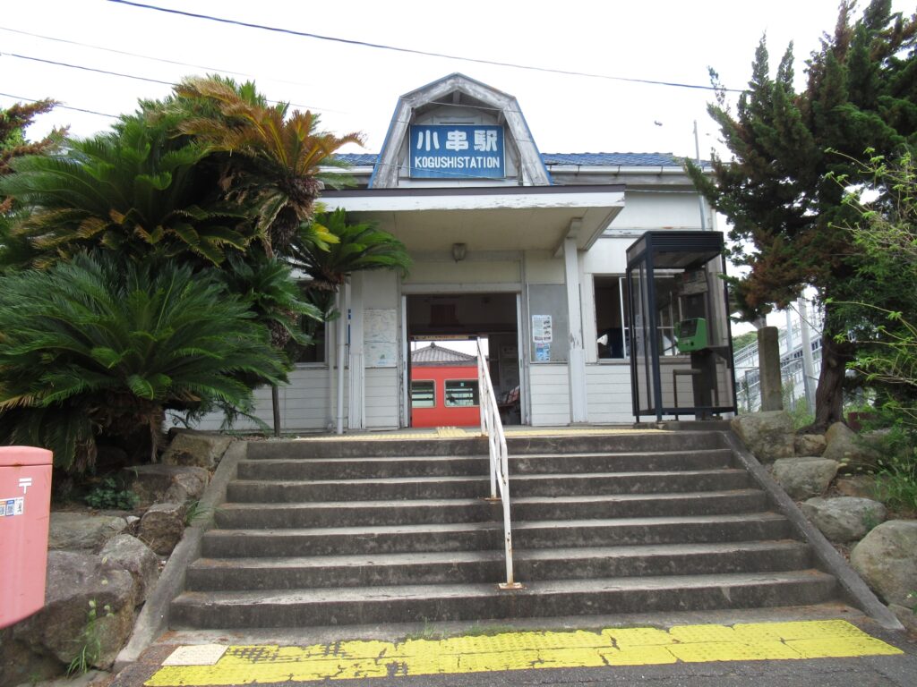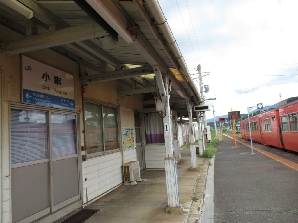 DoraNeko山陰本線の小串駅でございます。単線区間にある地上駅で、単式島式複合型の2面3線、いわゆる国鉄型配線の駅となっております。印象的なデザインの木造平屋建て駅舎のある無人駅でございます。ホーム間は跨線橋で連絡しております。訪問時はこの駅から長門市駅までの間が災害による不通区間、バス代行による運行となっておりましたのでございます。
