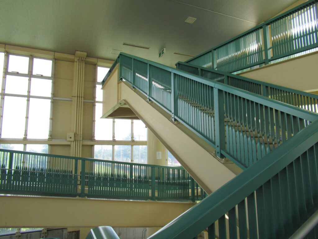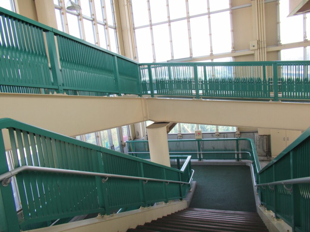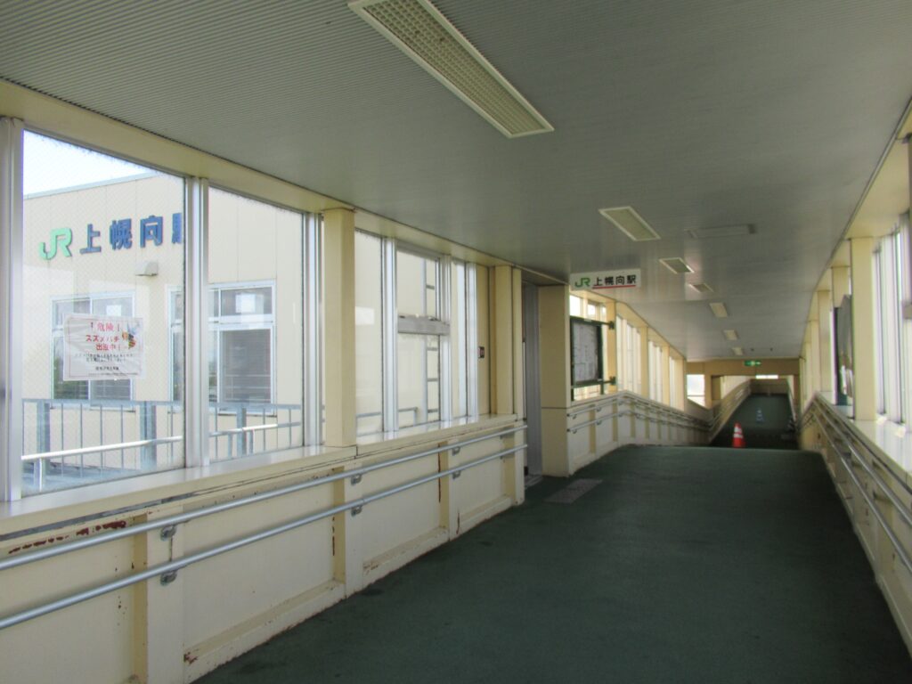 DoraNeko函館本線の上幌向駅でございます。複線区間にある島式1面2線の地上駅で、橋上駅となっております。自由通路を兼ねた上屋付き跨線橋に改札口がある無人駅でございます。この跨線橋は線路を跨ぐのみならず並行する国道12号線も跨いで計3か所に地上への出入口があるもので、スカイロードと名付けられております。橋と地上部を結ぶ建屋は中に階段とスロープが組み合わさって配置されているユニークなものになっております。駅周辺は近年に宅地開発が進んだ新興住宅地でございます。