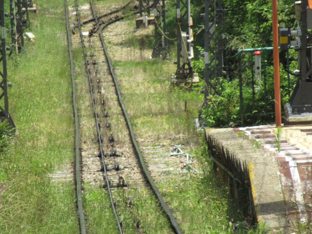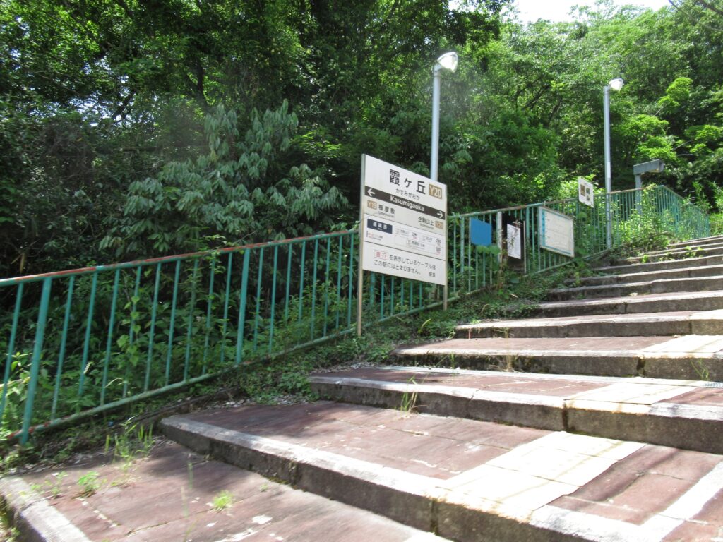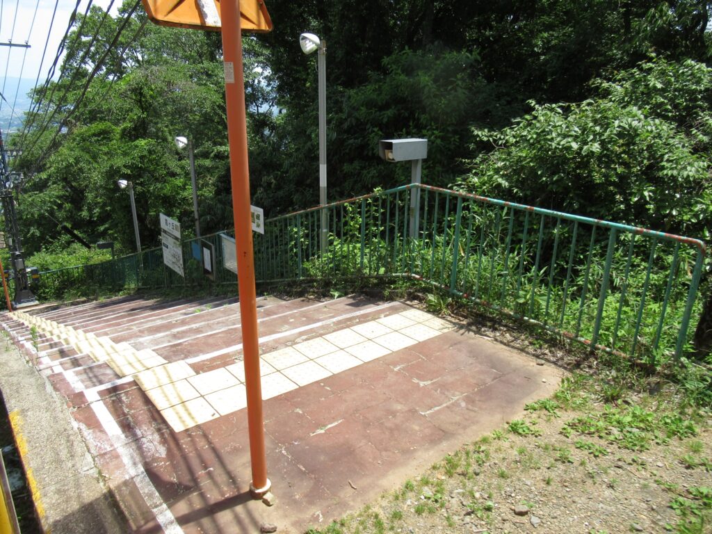 DoraNeko近畿日本鉄道生駒鋼索線の山上線、霞ヶ丘駅でございます。山上線に2駅ある途中駅の一つでございます。単式1面1線の無人駅となっております。駅の周りには細い山道しかなく、滅多に乗降客がない秘境駅となっております。この駅が設置されている理由は宝山寺本堂と奥の院への参拝客のために梅屋敷駅を設置したため交走式ケーブルカーなので梅屋敷駅に停車するにはここでも反対方向の車両は停車しなくてはならないからというものでございます。この駅に出入りするためにはケーブルカーには珍しい踏切を通らなければならないのでございます。