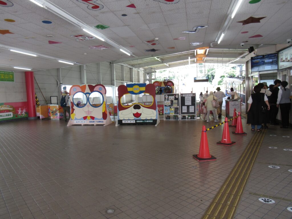 近畿日本鉄道生駒鋼索線の宝山寺線、鳥居前駅でございます。宝山寺線は2つのケーブルカーが並ぶ複線で、それぞれ宝山寺1号線と宝山寺2号線とよばれております。運行上は単線並列形態となっております。通常時は車両がミケとブルと呼ばれている動物型車両の宝山寺1号線が運行されており、1号線が点検で休止の時は2号線が運行されます。生駒聖天と呼ばれる宝山寺への参拝客が増える正月などの多客期には2号線も同時に運行されるのでございます。吾輩、久々に乗車いたしますのです。