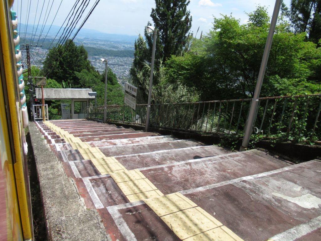 近畿日本鉄道生駒鋼索線の山上線、梅屋敷駅でございます。山上線に2駅ある途中駅の一つで、単式1面1線の無人駅でございます。宝山寺本堂へは上り坂になる宝山寺駅よりもこの駅からの方が便利、および宝山寺奥之院へはこちらが最寄り駅なため、一定の利用客がございます。