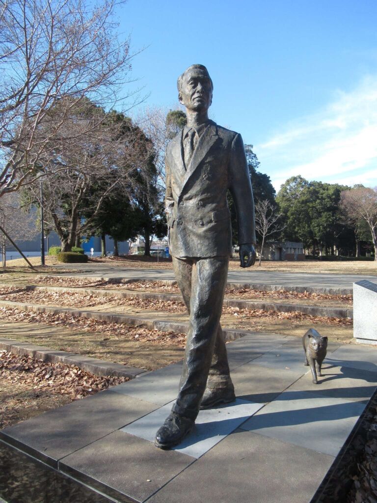 DoraNeko数々の像やモニュメントがございます、つくばエクスプレスつくば駅と科学館つくばエキスポセンターの間に広がるつくば市中央公園でございます。その中に設置されているうちのひとつ、「散歩する朝永振一郎博士」でございます。柴田良貴さんの作品ですな。猫を引き連れてのお散歩でございますな。