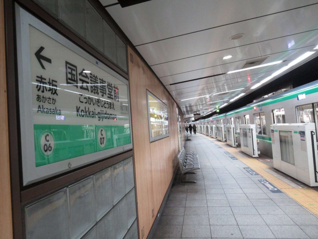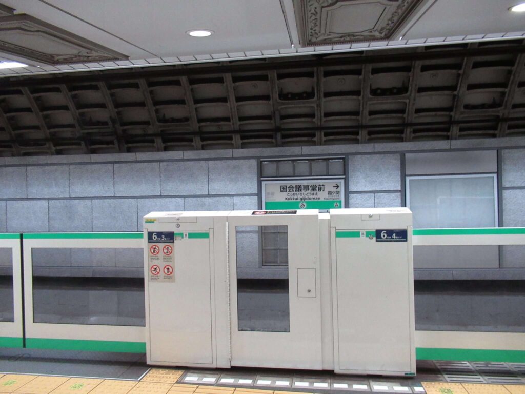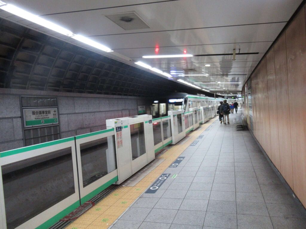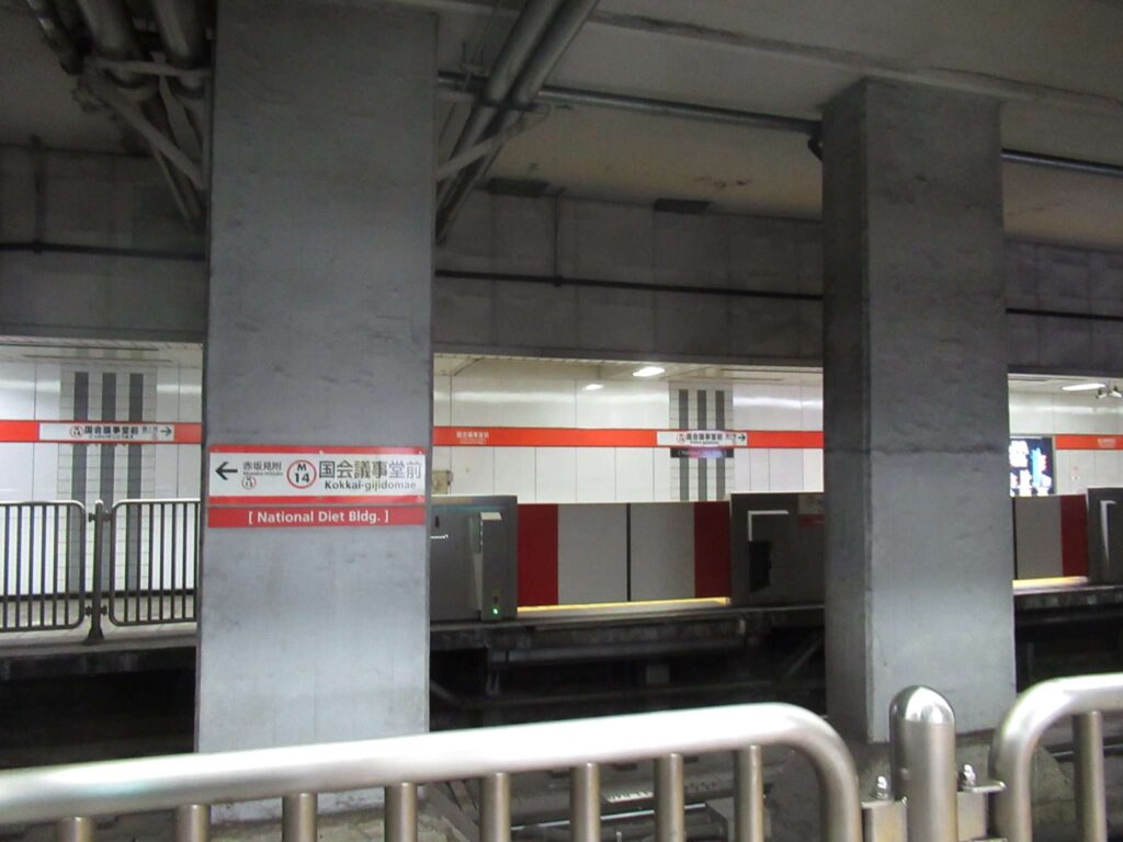 DoraNeko東京メトロこと東京地下鉄千代田線と丸ノ内線の国会議事堂前駅でございます。丸ノ内線は地下2階にある相対式2面2線、千代田線は地下6階にある島式1面2線の地下駅となっております。銀座線と南北線の溜池山王駅と改札内で繋がっており、同一駅として扱われております。千代田線ホームは地上から37.9 mの深さにあり、核シェルターなのだとする都市伝説が存在致します。