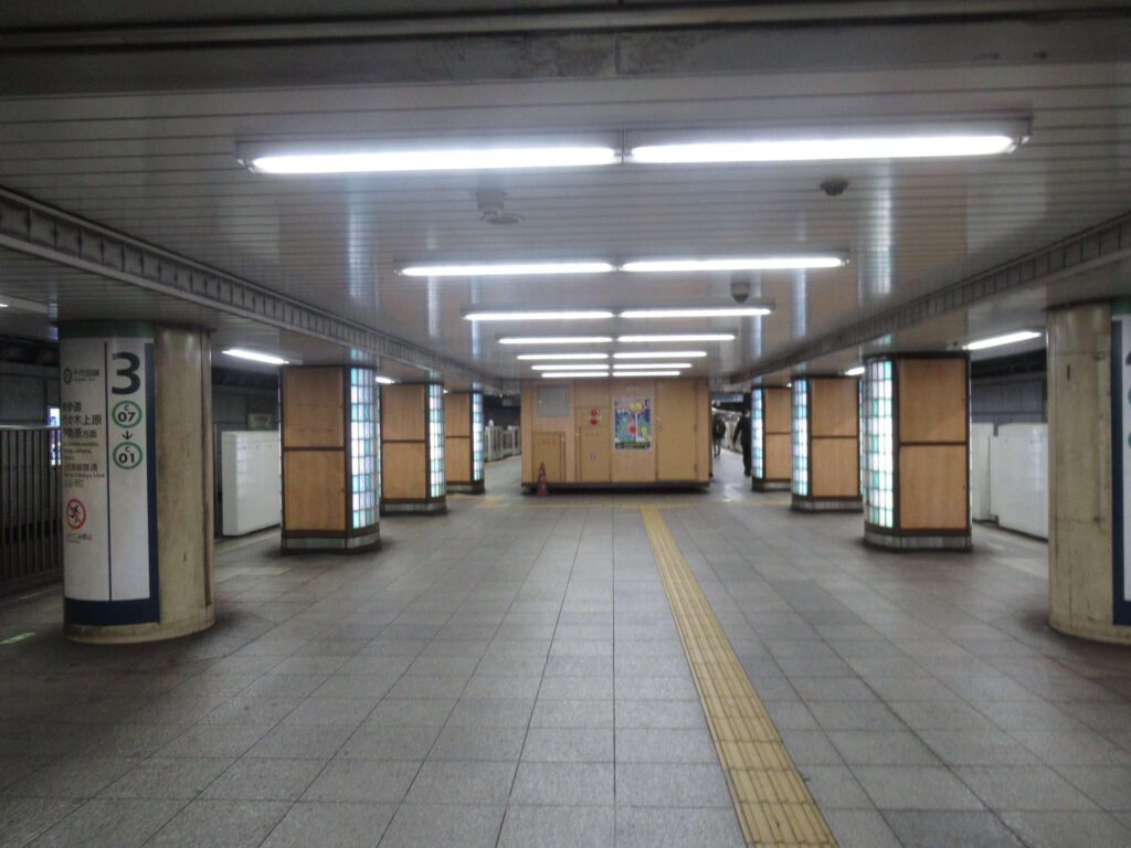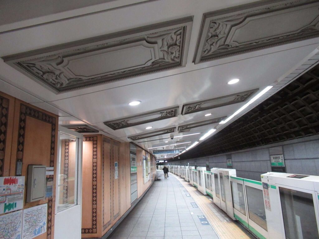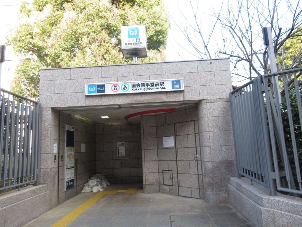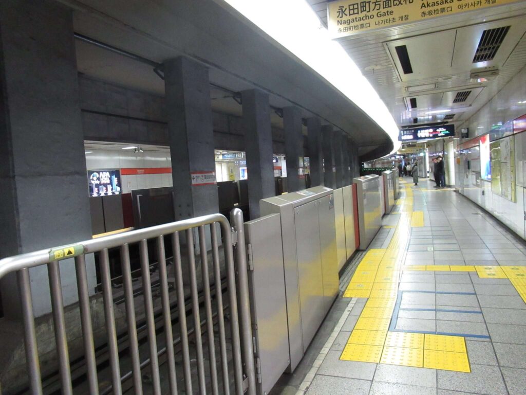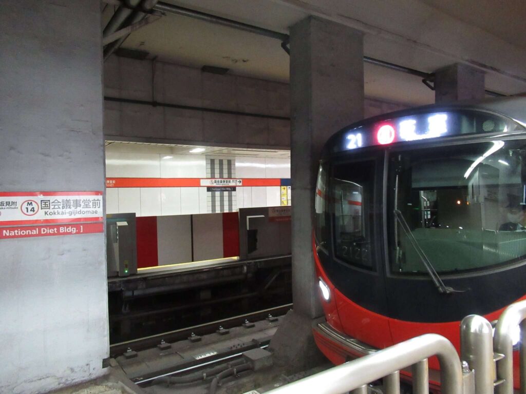 DoraNeko東京メトロこと東京地下鉄千代田線と丸ノ内線の国会議事堂前駅でございます。丸ノ内線は地下2階にある相対式2面2線、千代田線は地下6階にある島式1面2線の地下駅となっております。銀座線と南北線の溜池山王駅と改札内で繋がっており、同一駅として扱われております。千代田線ホームは地上から37.9 mの深さにあり、核シェルターなのだとする都市伝説が存在致します。
