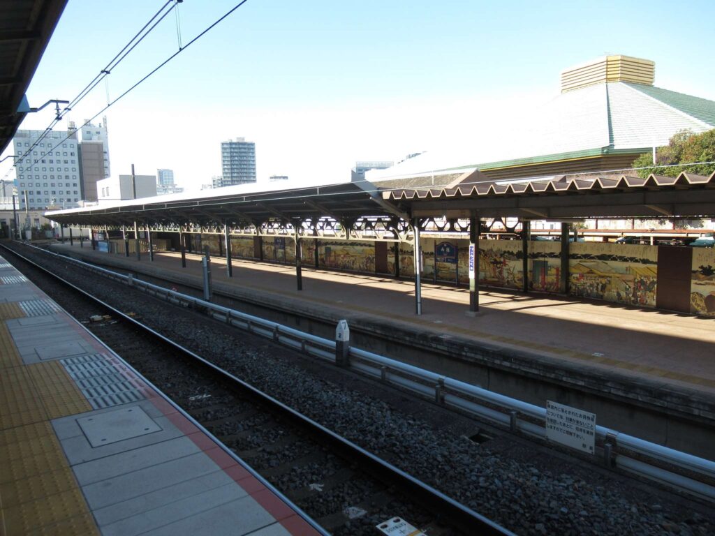 両国駅(りょうごくえき)は、東京都墨田区横網一丁目にある、東日本旅客鉄道(JR東日本)・東京都交通局(都営地下鉄)の駅である。墨田区最西端の駅。JR東日本の総武本線(支線)、東京都交通局の都営地下鉄大江戸線が乗り入れ、接続駅となっているが、一番近い出口同士でも300メートル余り離れている。JR東日本の駅は、定期列車は緩行線を走る中央・総武線各駅停車のみが停車する。この他、千葉方面の快速線に接続している列車ホームが存在するが、現在は臨時列車のみに使用される。また、特定都区市内制度における「東京都区内」に属する。元来、両国とは両国橋を挟んだ隅田川の両岸を指す地名であった(隅田川西岸は旧・日本橋両国)。しかし、総武鉄道は当初隅田川の東岸までの開通に留まったため、両国橋の東、東両国に両国橋駅を開業し、後に両国駅と改称した。駅名の影響に両国国技館の開設も加わり、現在では両国という地名は専ら両国橋の東の地域に対して用いられる。JRの駅は東西に出入口があり(階段の位置はホームの両端ではなくやや中央寄り)、駅舎は高架下にある。ホーム横にはターミナル駅の面影を残す駅舎とホームが残されている。この旧駅舎コンコースを利用し、居酒屋チェーン「はなの舞」の独自業態「大江戸八百八町・花の舞 両国国技館前店」が営業していたが閉店(後に清澄通り沿い錦糸町方の高架下に「両国八百八町・花の舞 江戸東京博物館前店」として移転)。閉店後の旧駅舎を改装して2016年(平成28年)11月25日に複合飲食施設「-両国- 江戸NOREN」が開業した。総武線各駅停車用の島式ホーム1面2線の電車ホームと、単式ホーム1面1線の列車ホームを有する高架駅である。電車ホームから一段低い高さに列車ホームがある。当駅北側には、東京駅方面へ直通する総武快速線・総武トンネルの入口がある。当駅は開業当初東京都心のターミナル駅の一つとして機能していたことから、総武快速線東京駅(総武トンネル)開業前、長らく房総方面への中・長距離列車の発着ホームとして広い構内設備を持っていた。列車ホームは当初は3 – 6番線の2面4線の櫛型形状であり、その北側に広大な留置線と貨物設備を有していた。この縮小部分には、のちに両国国技館や江戸東京博物館が建設されている。
