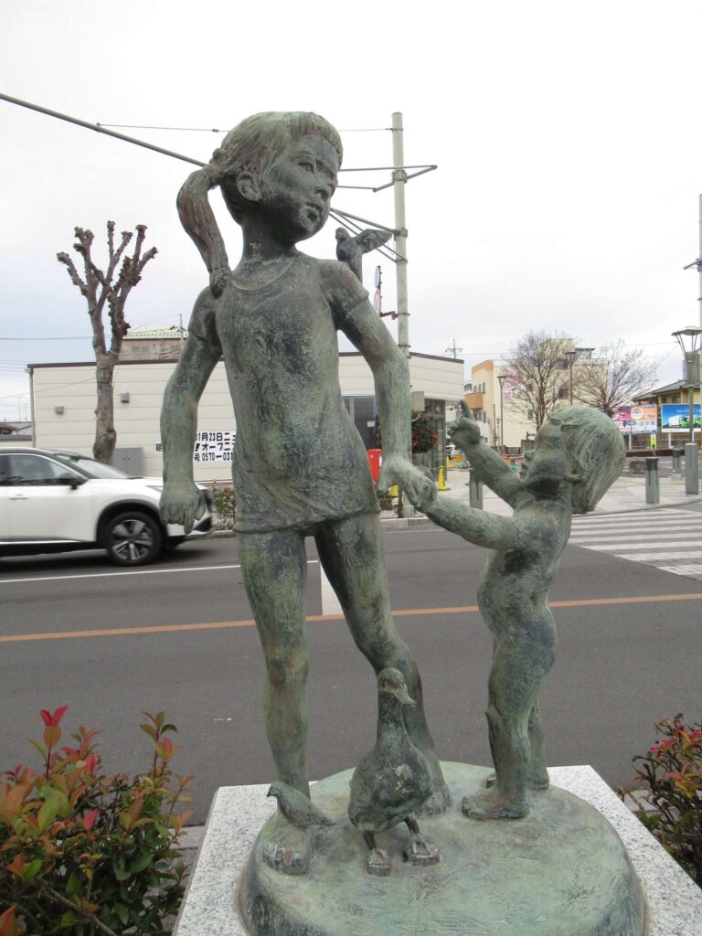 佐野駅南口から佐野市駅方向に向かう交差点角にあった街角彫刻、散歩でございます。作者等は掛かれていないので詳細は不明でございますよ、そこの奥さん(←何処の奥さん?)。