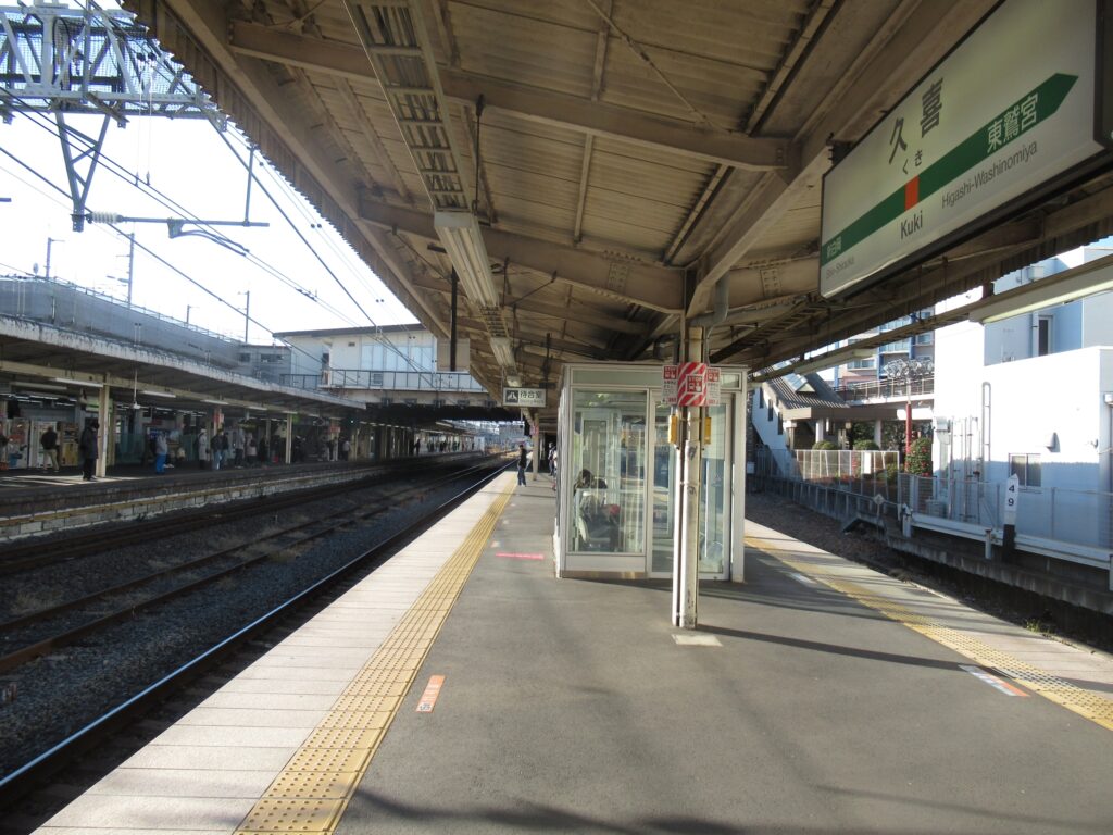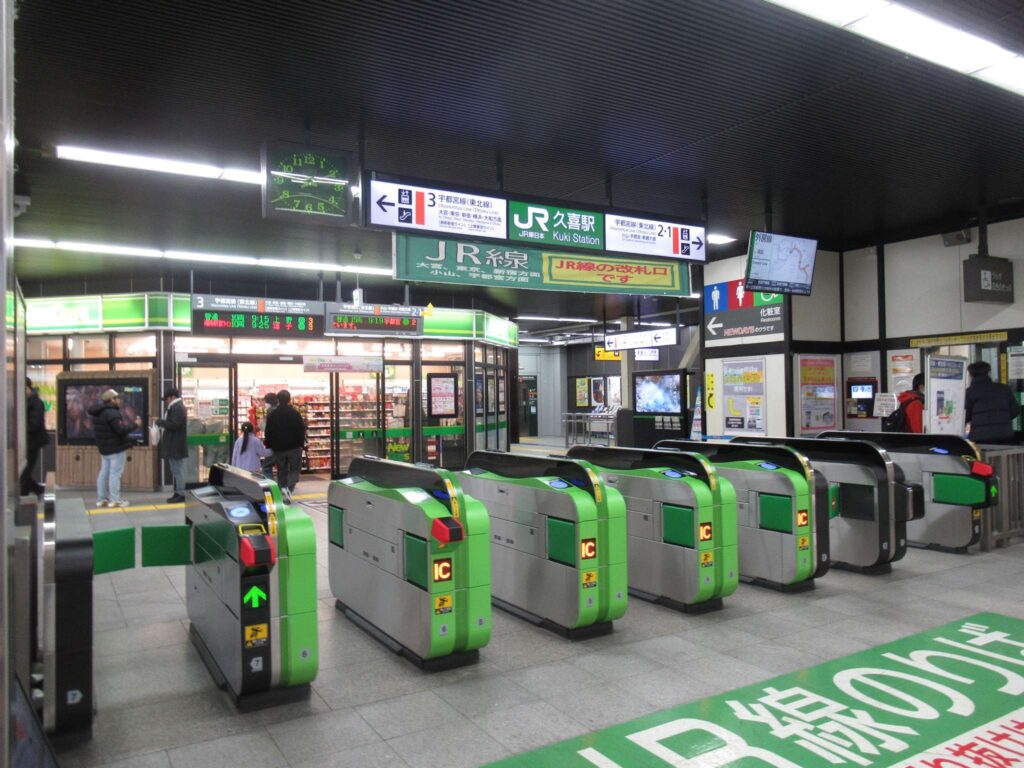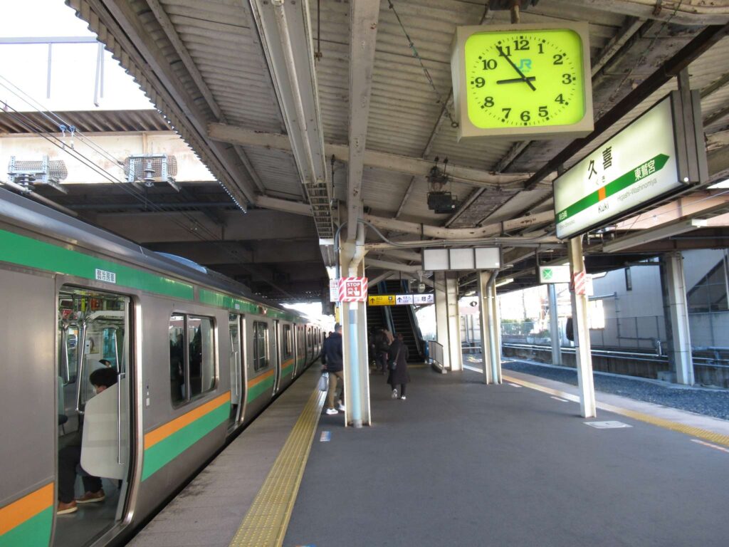 東北本線の久喜駅でございます。宇都宮線の愛称区間に含まれております。電化複線区間にある単式島式複合型2面3線とホームのない中線が1本ある地上駅となっており、隣接している東武伊勢崎線の久喜駅ともども東西連絡自由通路に改札がある橋上駅となっております。埼玉県立久喜高等学校などの最寄り駅となっております。