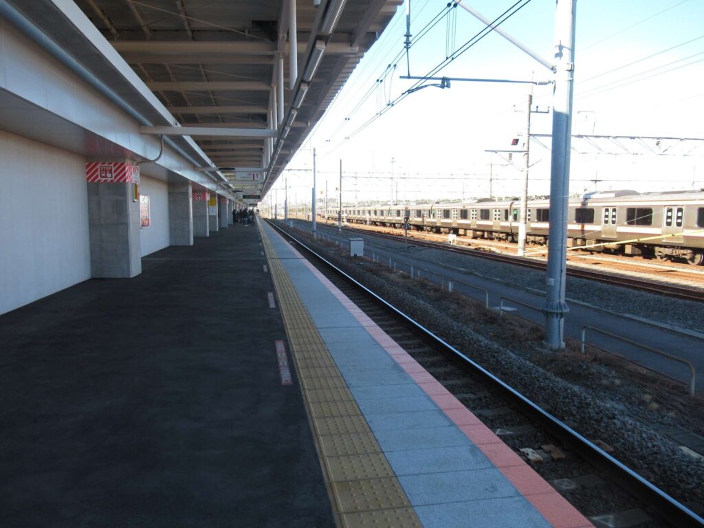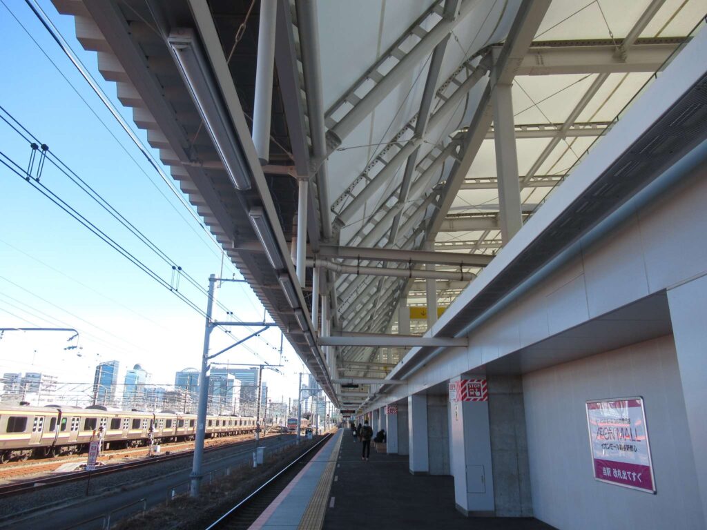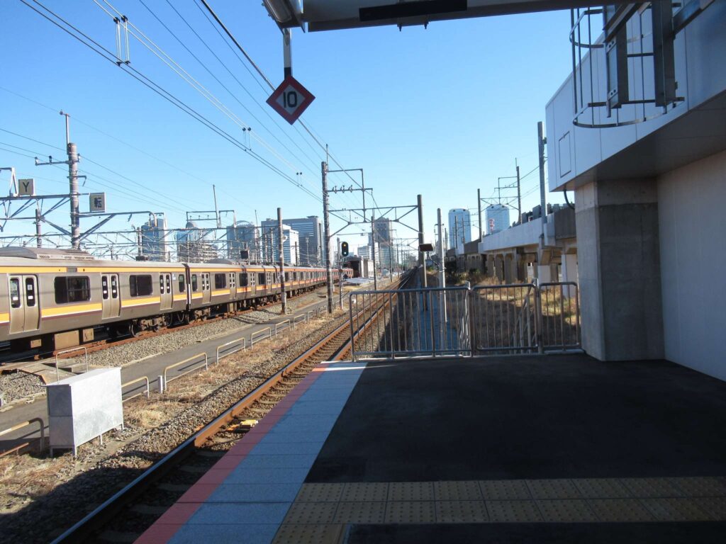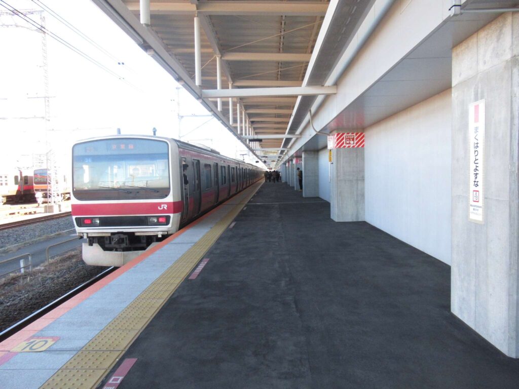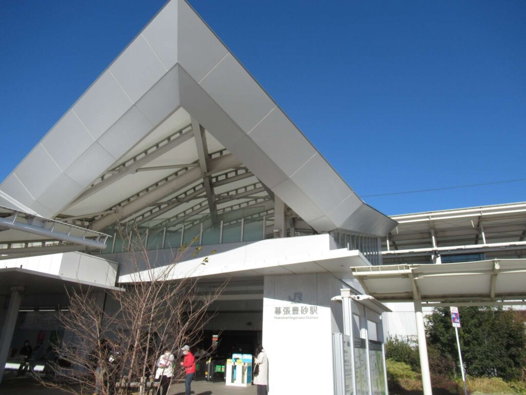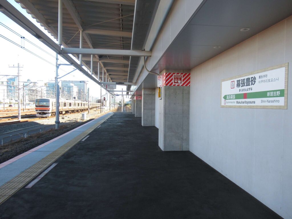 京葉線の幕張豊砂駅でございます。2023年(令和5年)3月に開業した請願駅で、京葉線で最も新しい駅でございます。下り線が地上部に単式1面1線のホーム、上り線が高架の単式1面1線のホーム、合わせて単式2面2線の構造でございます。かつてこの駅南側付近に貨物駅を開設する計画があったため、このような配線になっていたところに駅が設けられたという経緯でございます。北側には京葉車両センターがございます。駅舎は高架下に新設されております。イオンモール幕張新都心が目前にあるので、イオン新駅などと言われることがあるそうですが、実態は駅が出来ることになったので、イオンが進出したのが正確なようです、知らんけど(←知らんのかいw)。