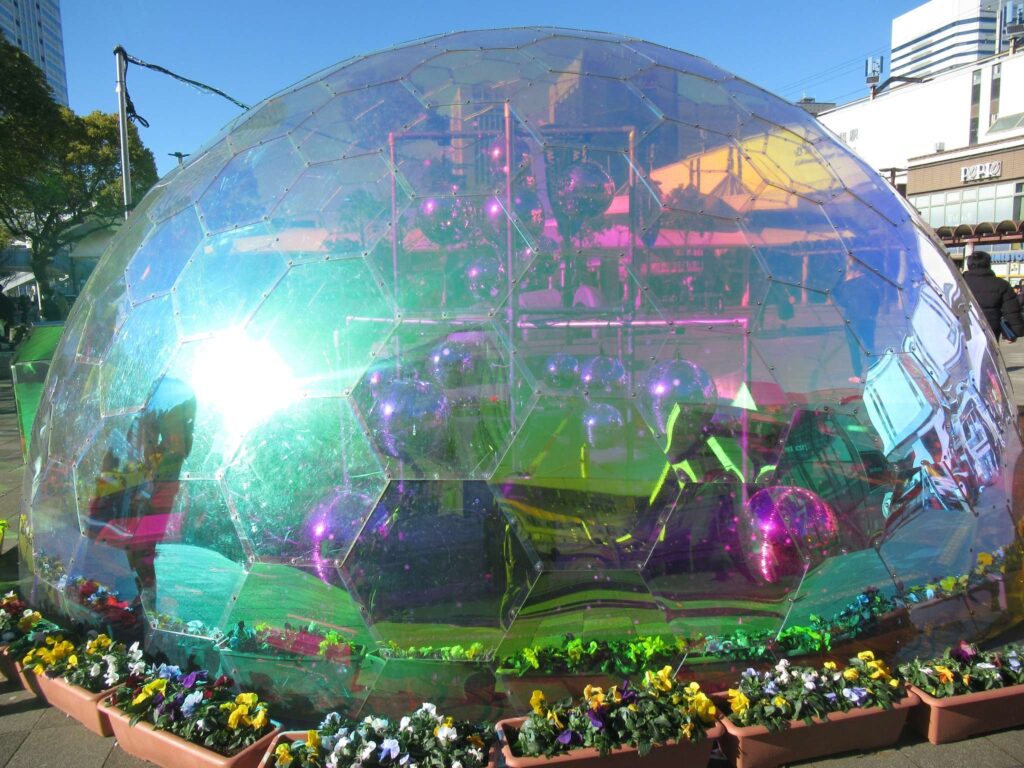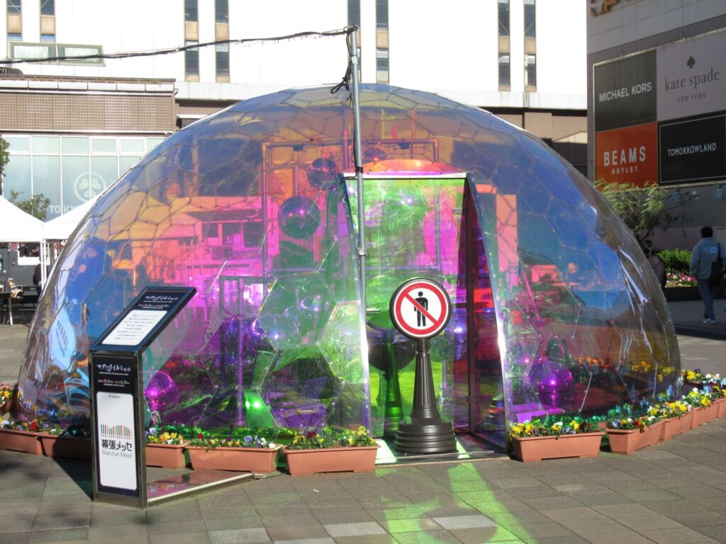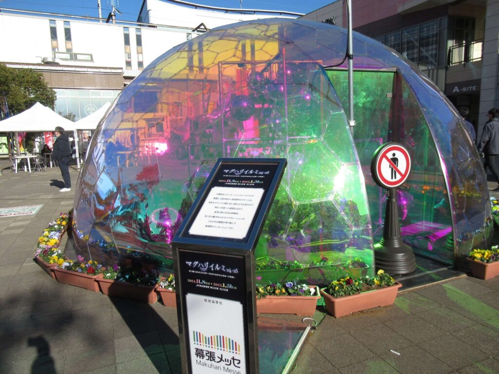 京葉線の海浜幕張駅前広場でございます。何やら眩しく光っている半球体があったので見てみますと、マクハリイルミなる期間限定のモニュメントでございました。真昼間でこのように美しいんですから夜になったらそりゃあ見事なんでしょうなぁそこの奥さん(←何処の奥さん?)。