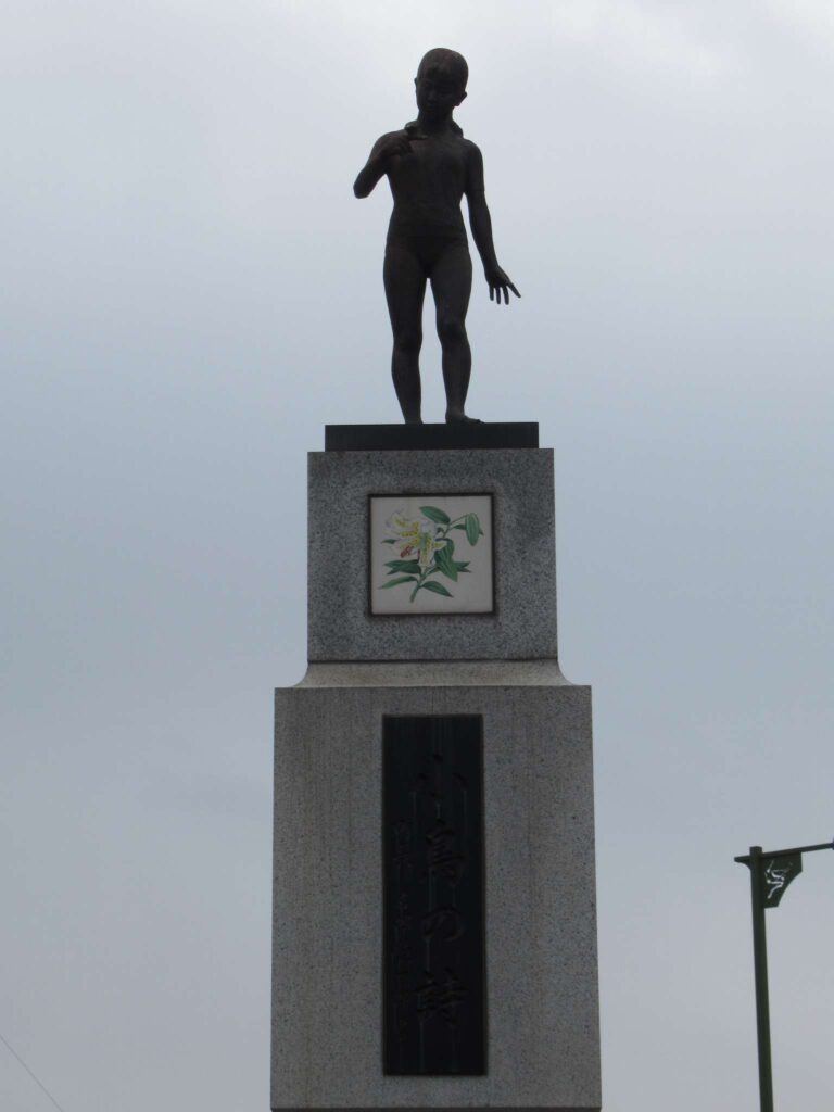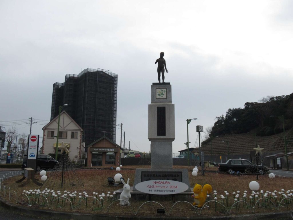 内房線の長浦駅南口ロータリーに建っているモニュメント、長い台座の上には像が建っております。タイトルは「小鳥の詩」と書かれております。作者等、詳細は不明でございます。