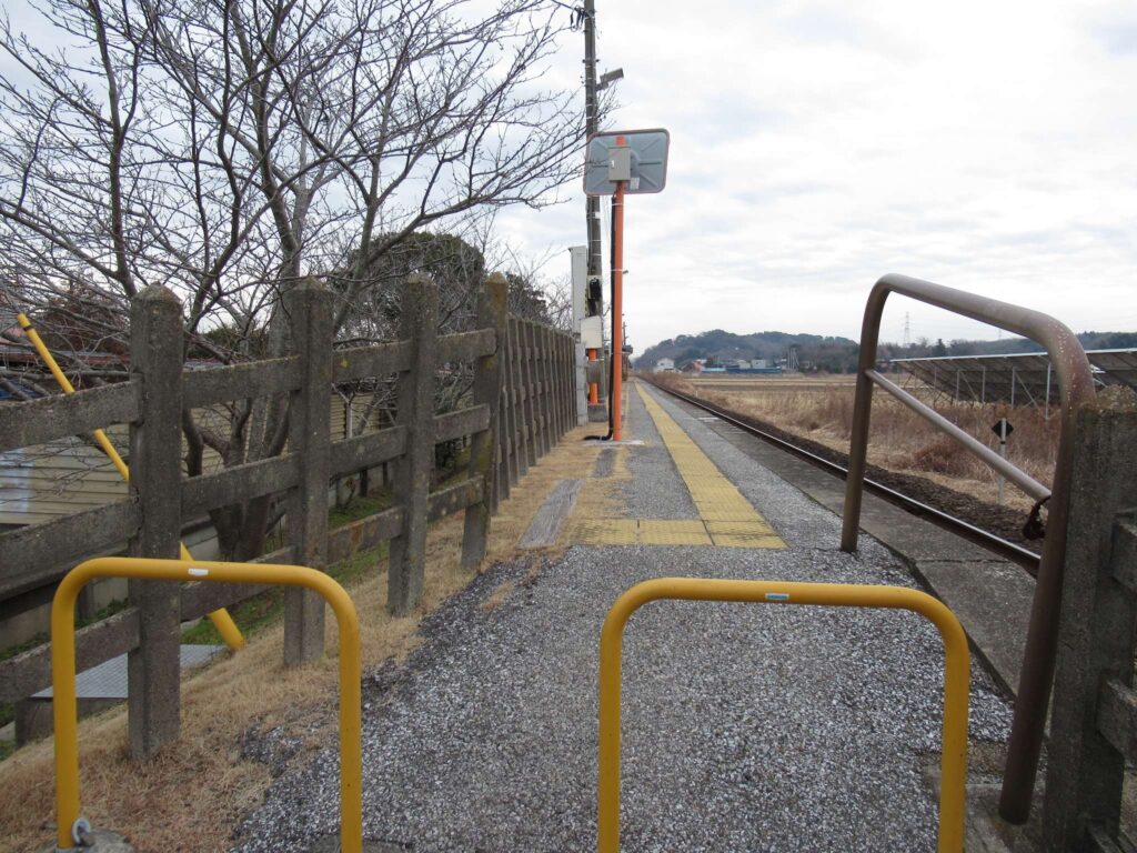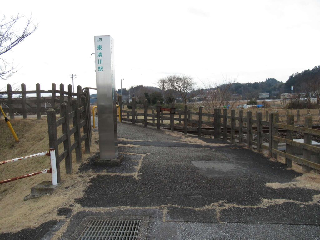 全線単線非電化の路線、久留里線の東清川駅でございます。単式1面1線の棒線駅となっております。駅舎のない無人駅で、ホーム上に待合所が設置されております。ホーム先端の通路から少し距離がある駅出入口まで伸びている道で直接行き来するようになっております。