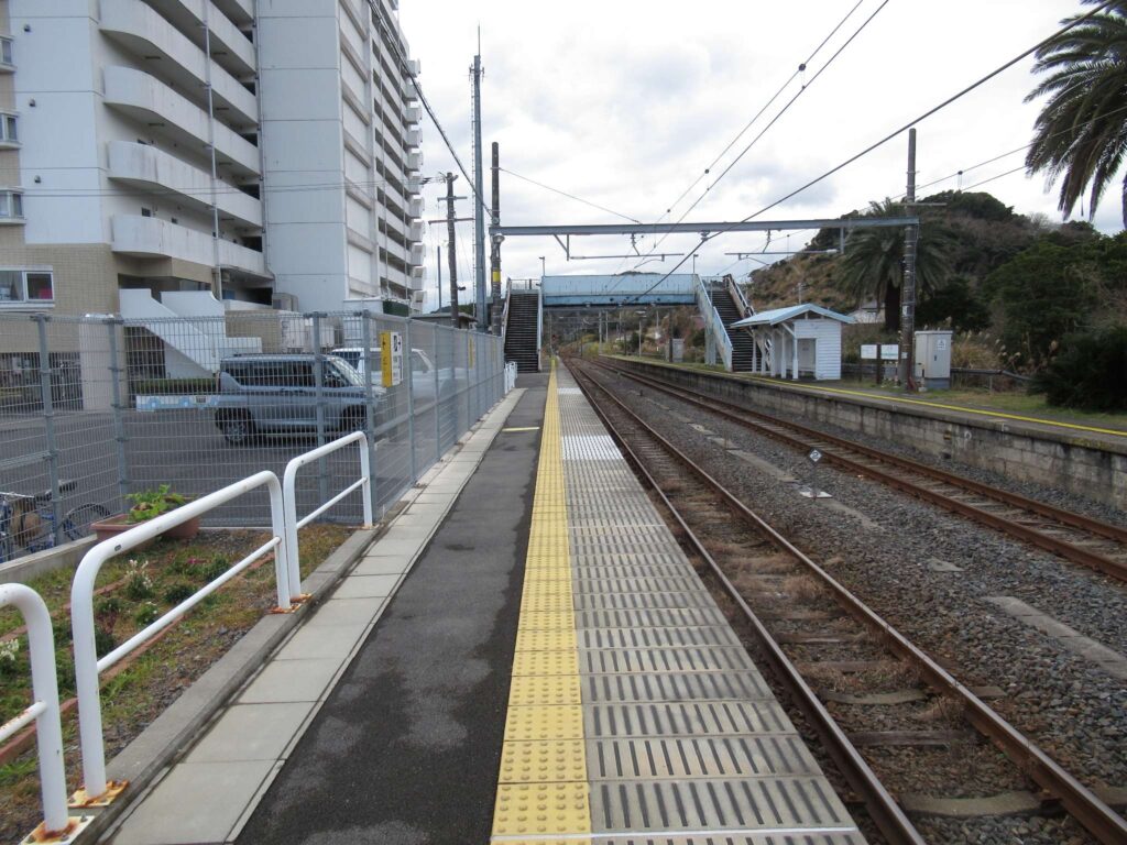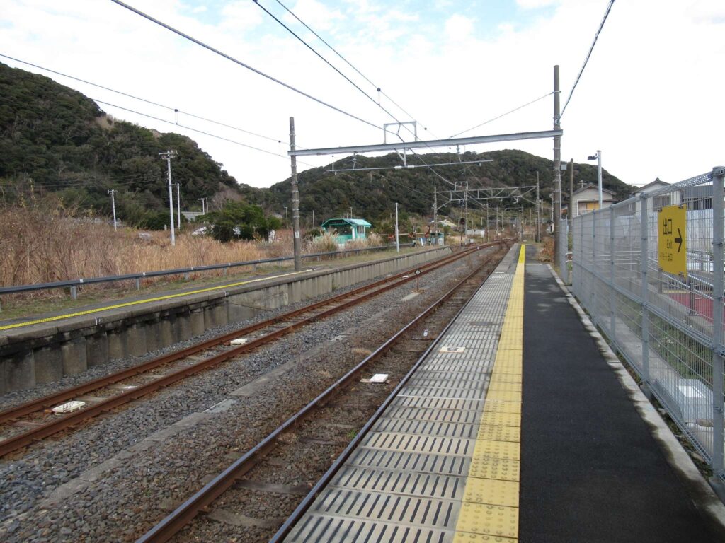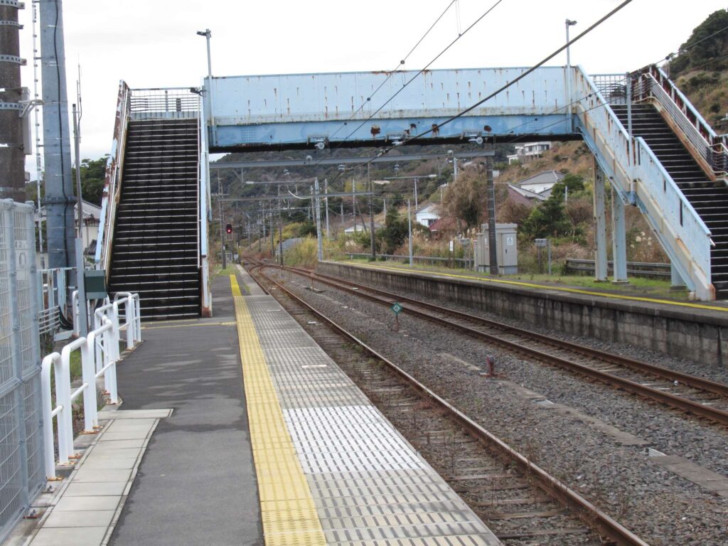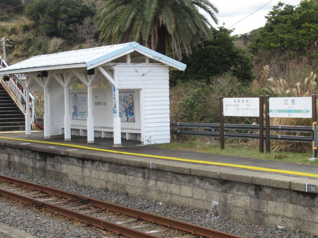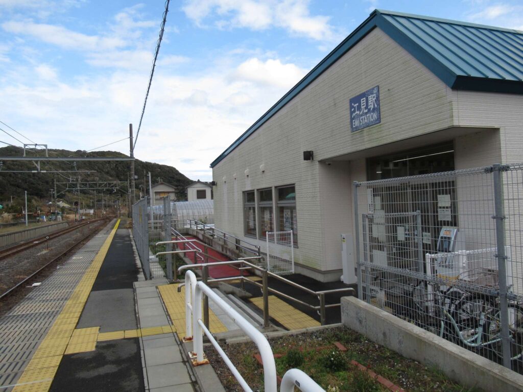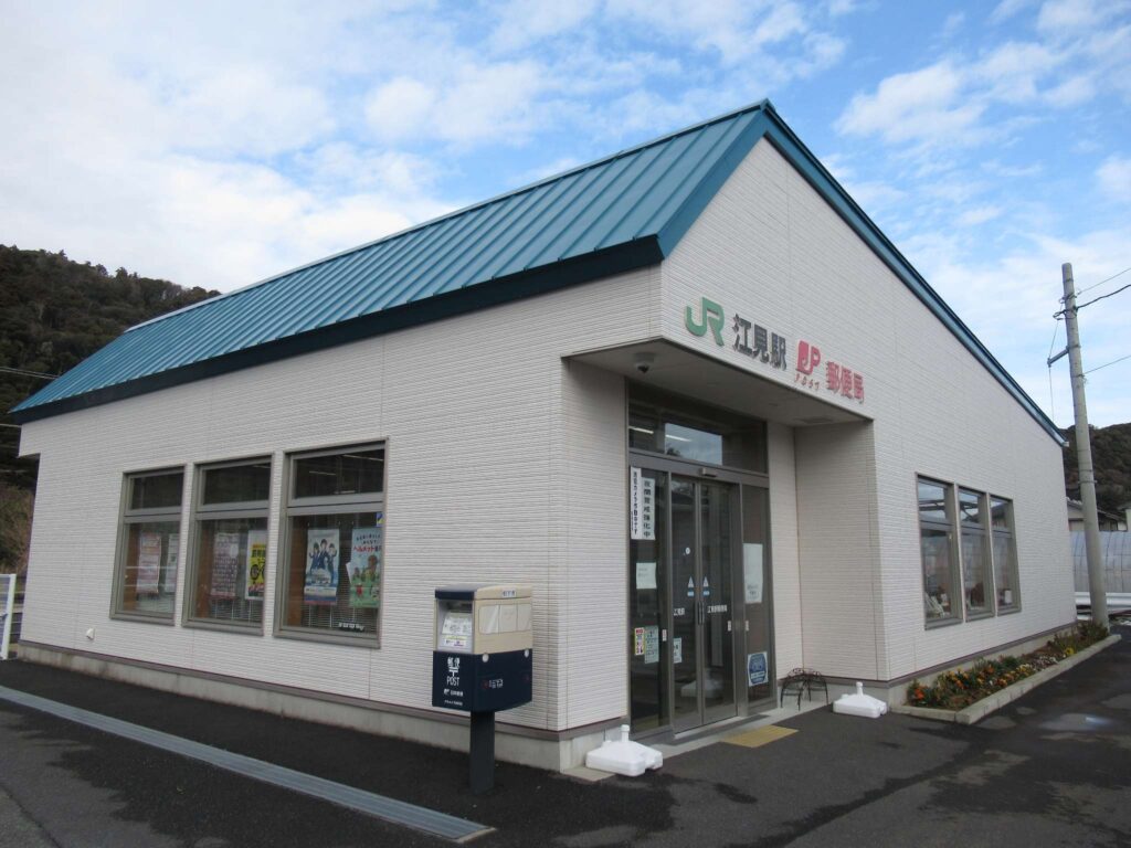 君津駅から安房鴨川駅まで単線電化の区間となっている内房線の江見駅でございます。相対式2面2線の地上駅で、2020年(令和2年)から駅舎が郵便局になっております。ホーム間は跨線橋で連絡しております。この駅は全国で初めて、日本郵便が駅業務を受託した業務委託駅となったのでございます。