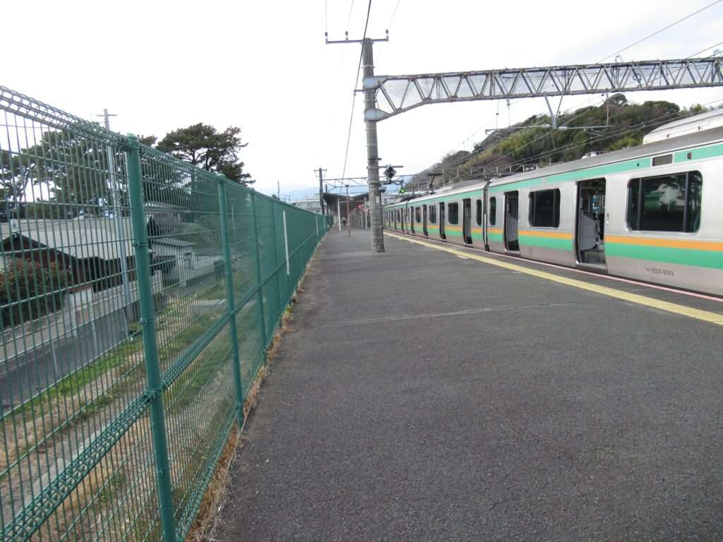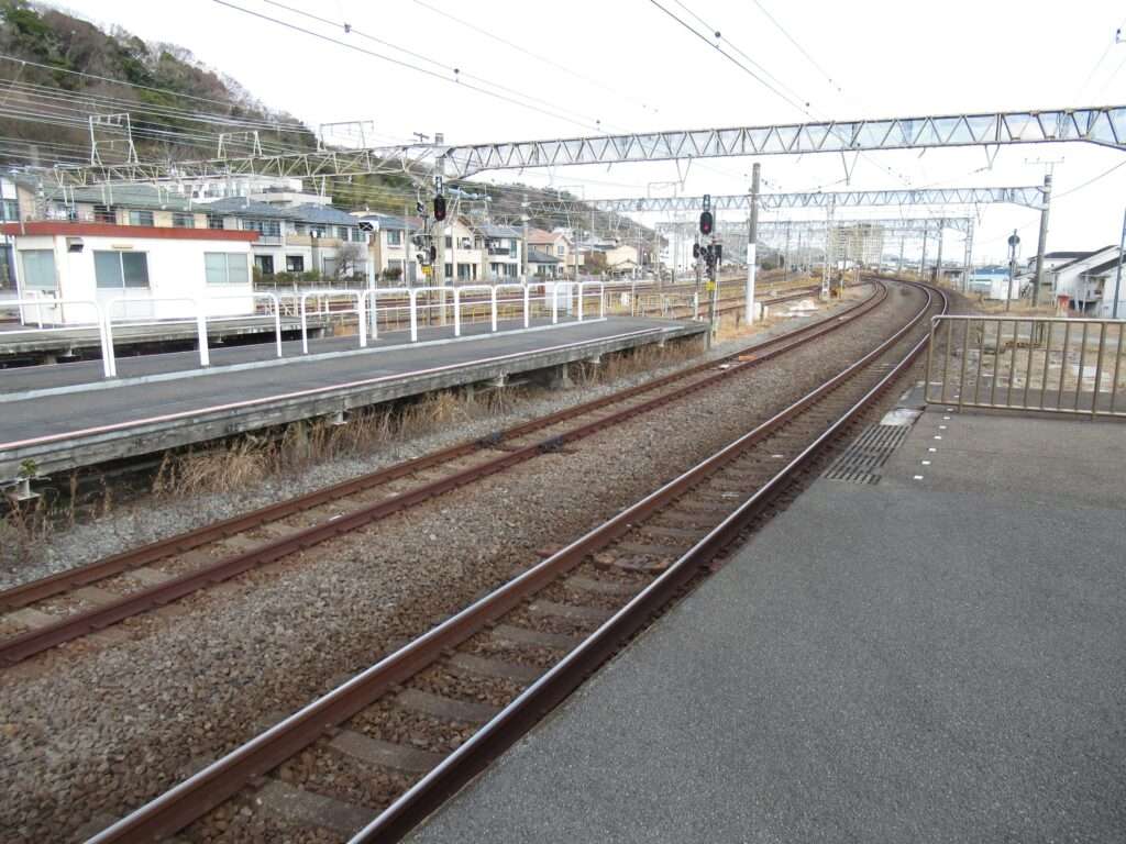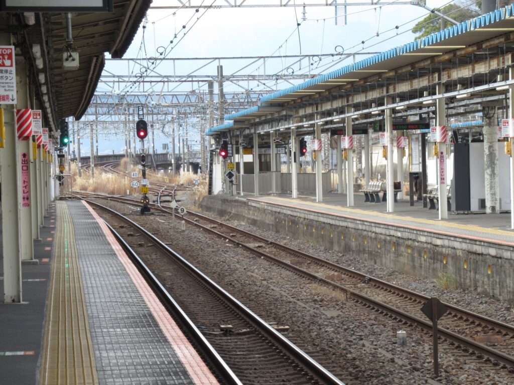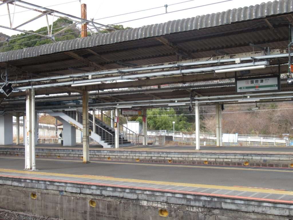 東海道本線と御殿場線の国府津駅でございます。単式1面1線と島式2面4線、合計3面5線の地上駅となっております。単式ホーム側にコンクリート造り4階建て駅舎があり、島式ホームへは地下道並びに跨線橋で連絡しております。御殿場線は単線ですが途中まで国府津車両センターへの出入庫線が並走しております。