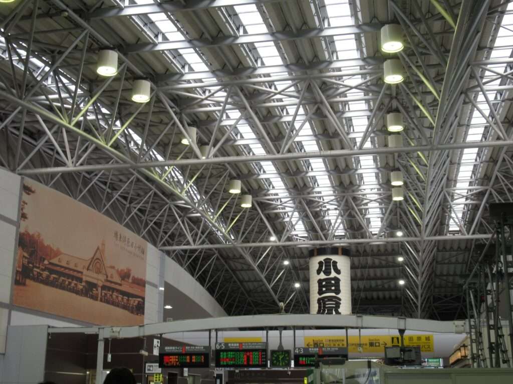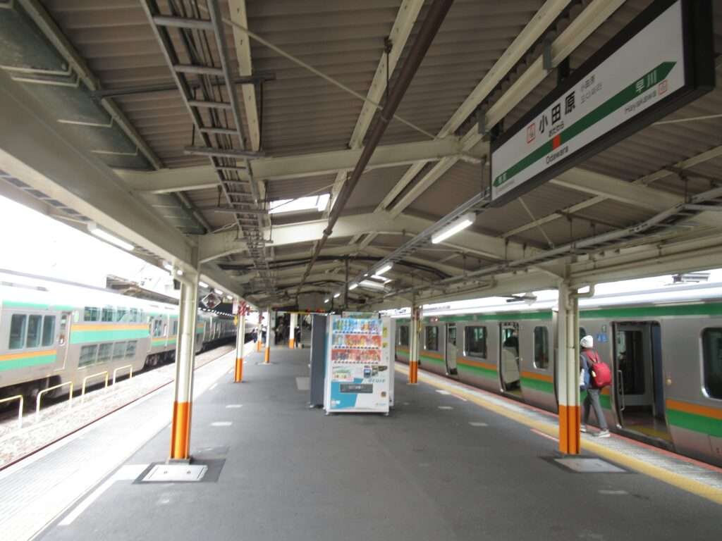 東海道本線の小田原駅でございます。島式2面4線の地上駅で、ホームのない貨物線2線と留置線2線が並行しております。東西自由通路に改札がある橋上駅でございます。東海道本線を走行する東海道線、上野東京ライン、湘南新宿ラインおよび熱海から伊東線に乗り入れる列車が発着致します。ここが始発・終着になる列車も数多く設定されております。