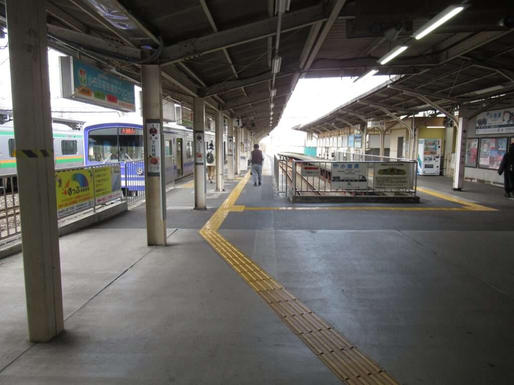 2022年夏以来2度目の訪問となりました、伊豆箱根鉄道大雄山線の小田原駅でございます。頭端式ホーム2面2線の構造でございます。そのうち単式1面は使用されていないので実質は頭端型島式1面です。伊豆箱根鉄道は神奈川県内の小田原駅と大雄山駅とを結ぶ大雄山線と、静岡県内の三島駅と修善寺駅を結ぶ駿豆線と、別の県に分かれて路線が存在する珍しい鉄道会社でございます。大雄山線に大きな整備工場がないため、大規模な定期検査などでは東海道本線経由で駿豆線にある大場工場まで車両を回送いたしますが、これもなかなか面白いですな。小田原駅は乗り入れる鉄道会社を通してホーム番号が割り振られており、大雄山線が1・2番線、JR東日本は3~6番線、小田急・小田急箱根こと箱根登山鉄道は7~11番線、JR東海の東海道新幹線が13・14番線となっております。