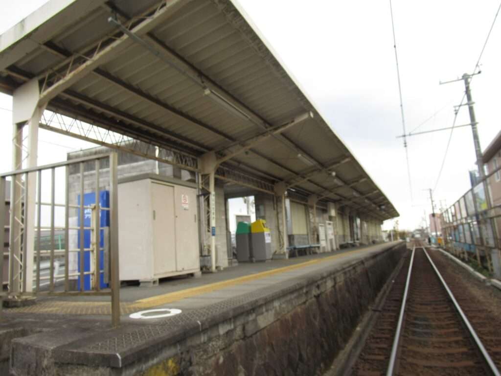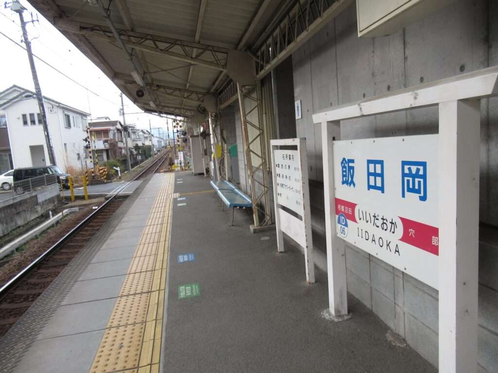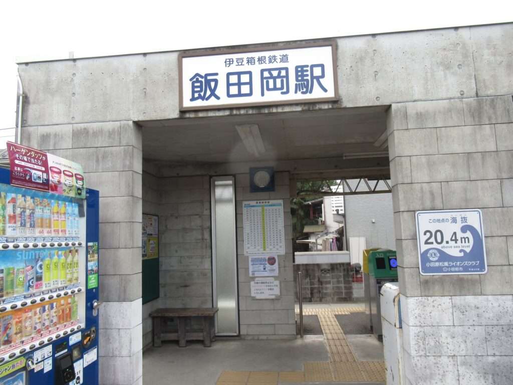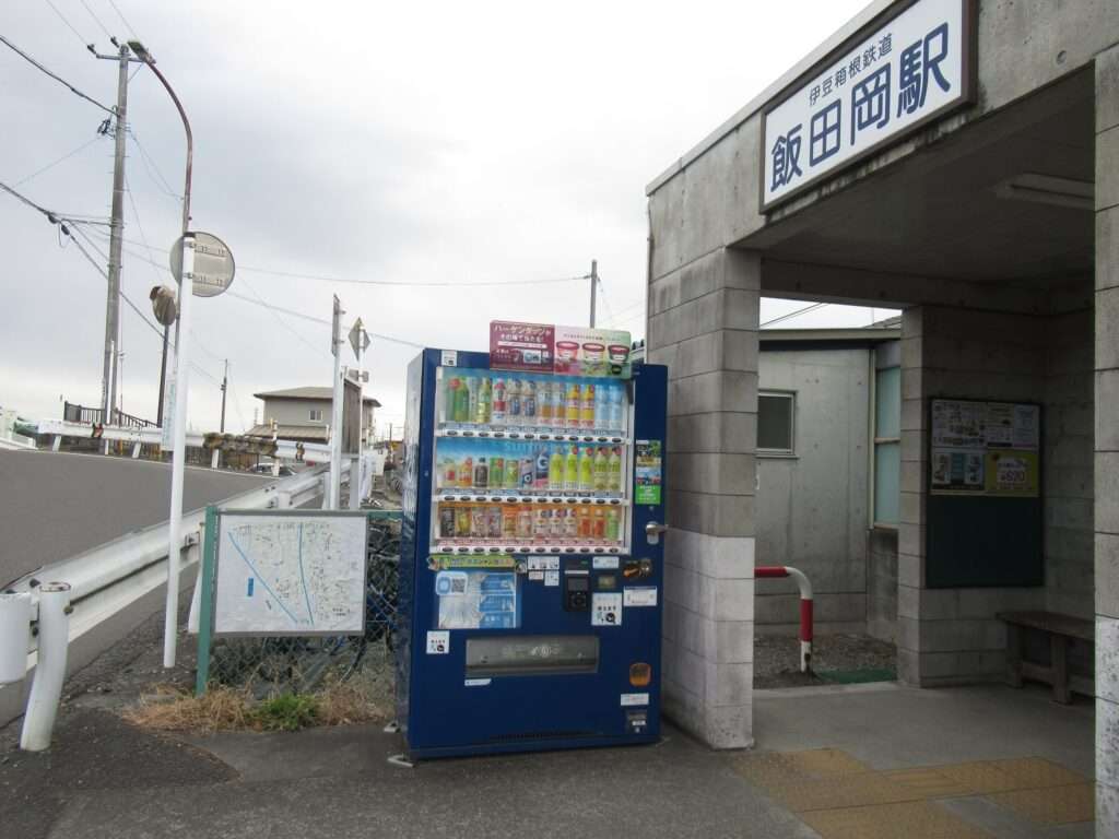 全線単線電化の路線、伊豆箱根鉄道大雄山線の飯田岡駅でございます。地上駅で、単式1面1線の棒線駅となっております。簡易な駅舎のある無人駅となっております。出入口の目の前は狩川に架る飯田岡橋でございます。