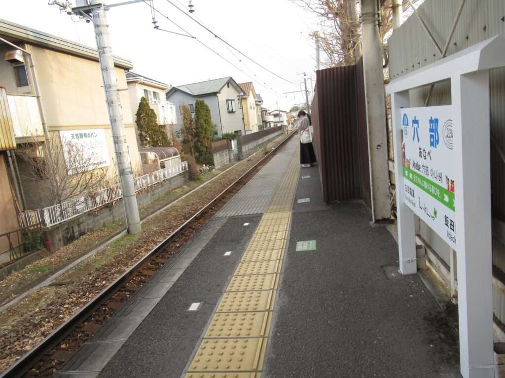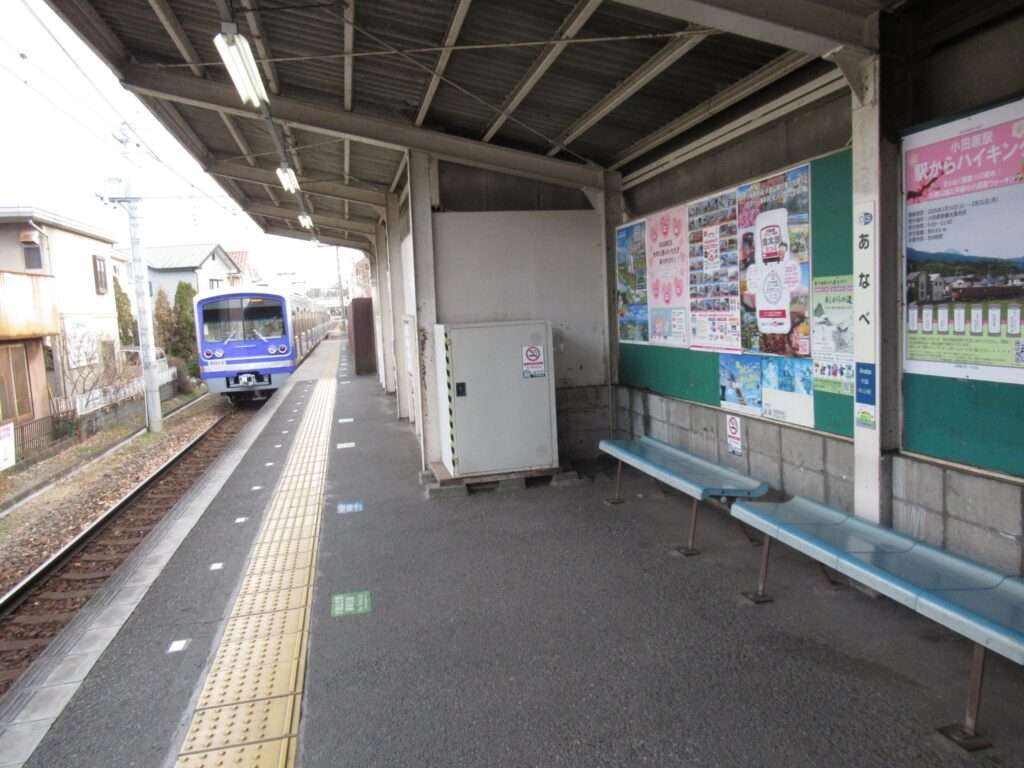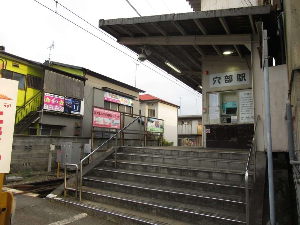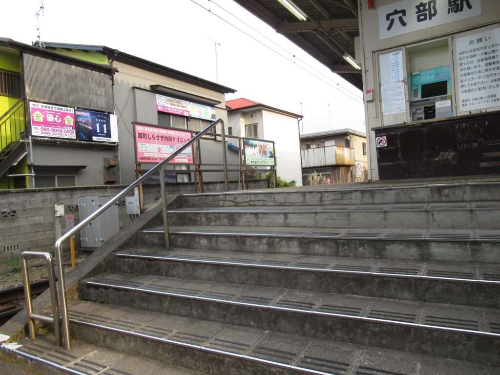 全線単線電化の路線、伊豆箱根鉄道大雄山線の穴部駅でございます。地上駅で、単式1面1線の棒線駅となっております。ホームの上に簡易な二階建て駅舎のある無人駅となっております。幅が狭い公道踏切に接しているホームの端の階段から直接出入りするようになっておりますが、この公道踏切はクルマが頻繁に通行しますし、とても狭いのでヒヤヒヤしますな。