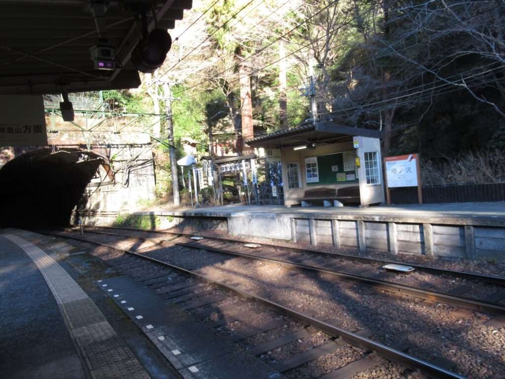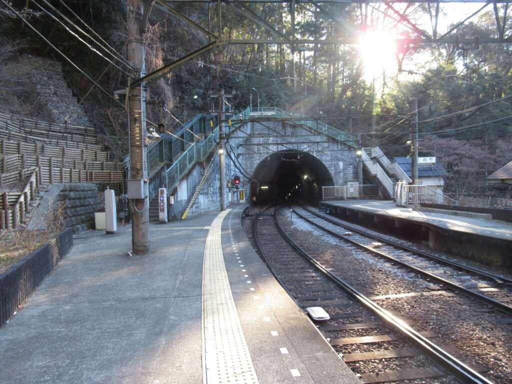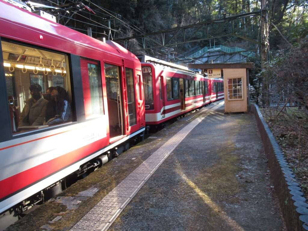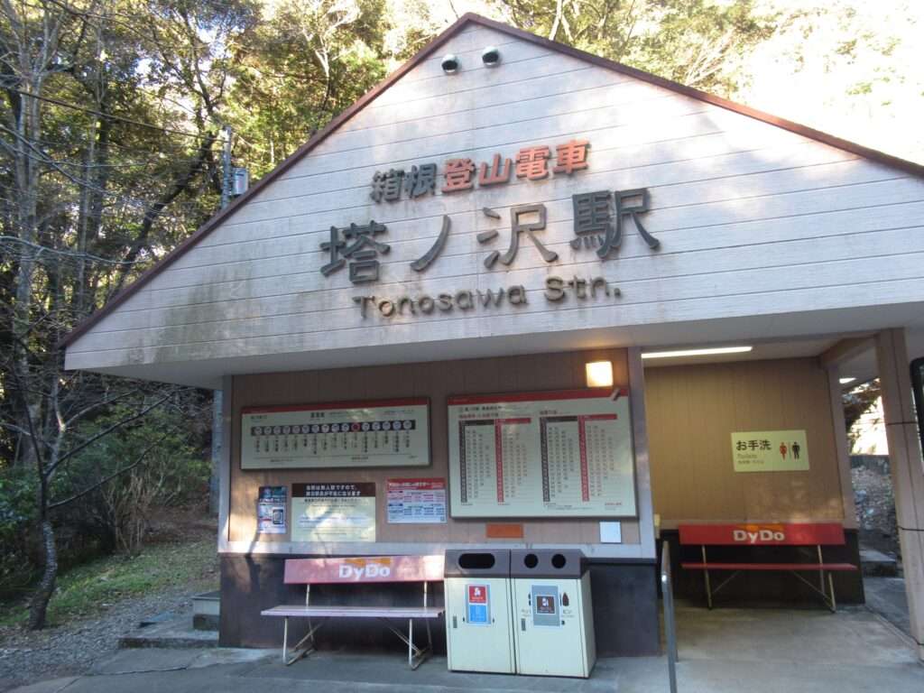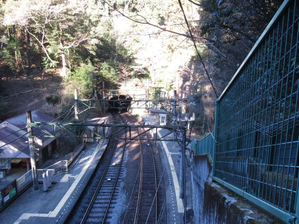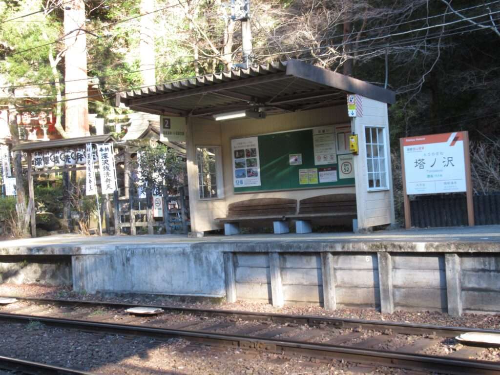 箱根登山鉄道線を引き継いだ箱根登山電車こと小田急箱根鉄道線の塔ノ沢駅でございます。単線電化区間にある列車交換可能な相対式2面2線の地上駅で、ホームはトンネルに挟まれた場所にございます。待合室とトイレのみの駅舎がある無人駅で、反対側の箱根湯本方面行ホームへはトンネルの入口上に設けられた階段通路での連絡となっております。こちらのホーム脇に深澤銭洗弁財天がございます。この駅は山の中に位置していて、国道1号の玉ノ緒橋付近からクルマが通行できない狭い坂道を登ってくるしか到達手段がないため、ある意味「秘境駅」に近しい雰囲気なのでございます。