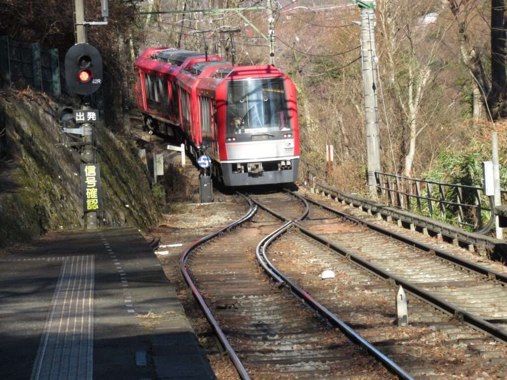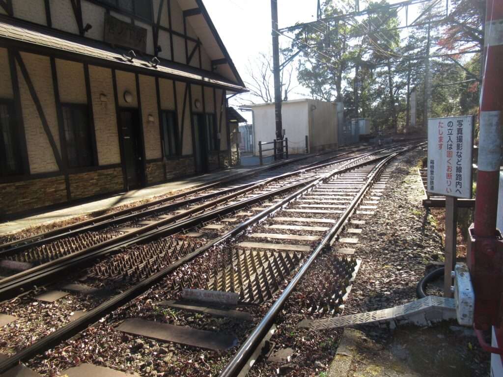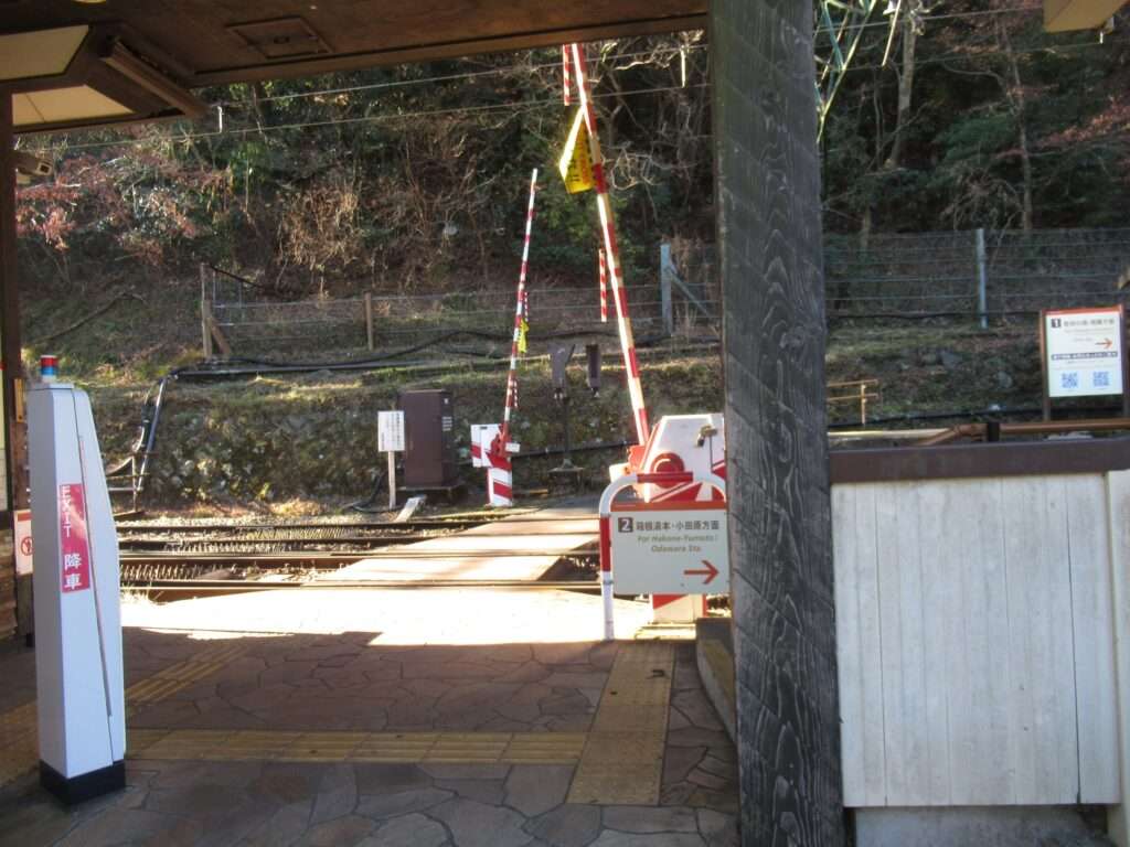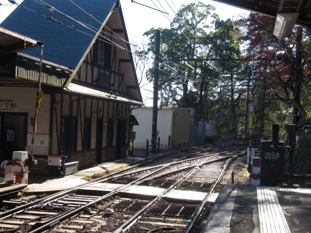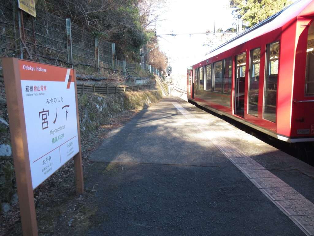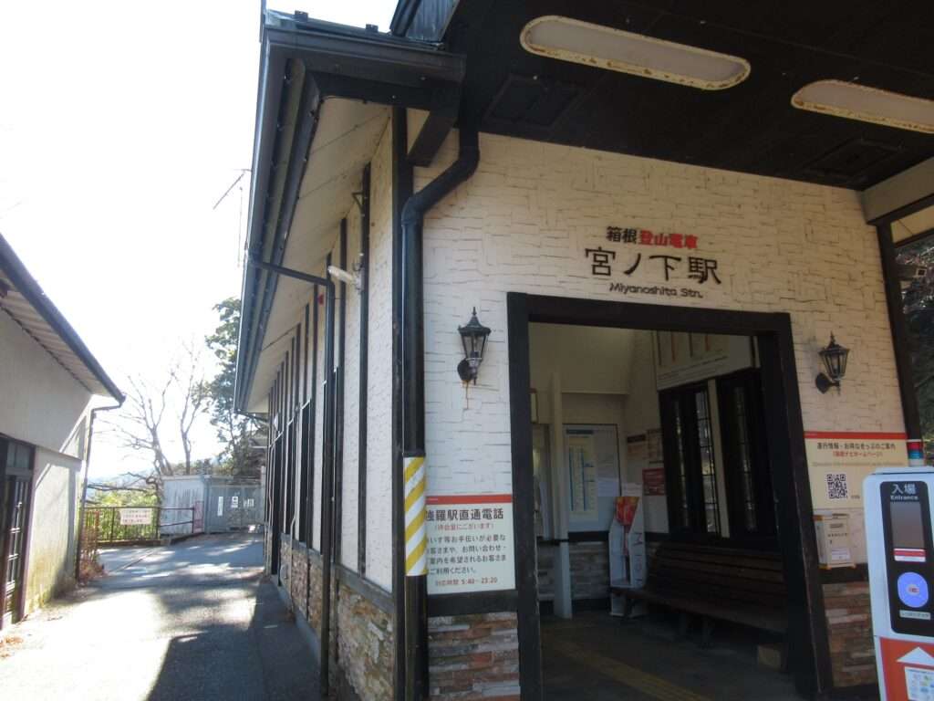 箱根登山鉄道線を引き継いだ箱根登山電車こと小田急箱根鉄道線の宮ノ下駅でございます。単線電化区間にある列車交換可能な相対式2面2線の地上駅となっております。三角屋根が印象的な山小屋風デザインの駅舎がある無人駅で、反対側ホームとは遮断機付きの構内踏切で連絡しております。