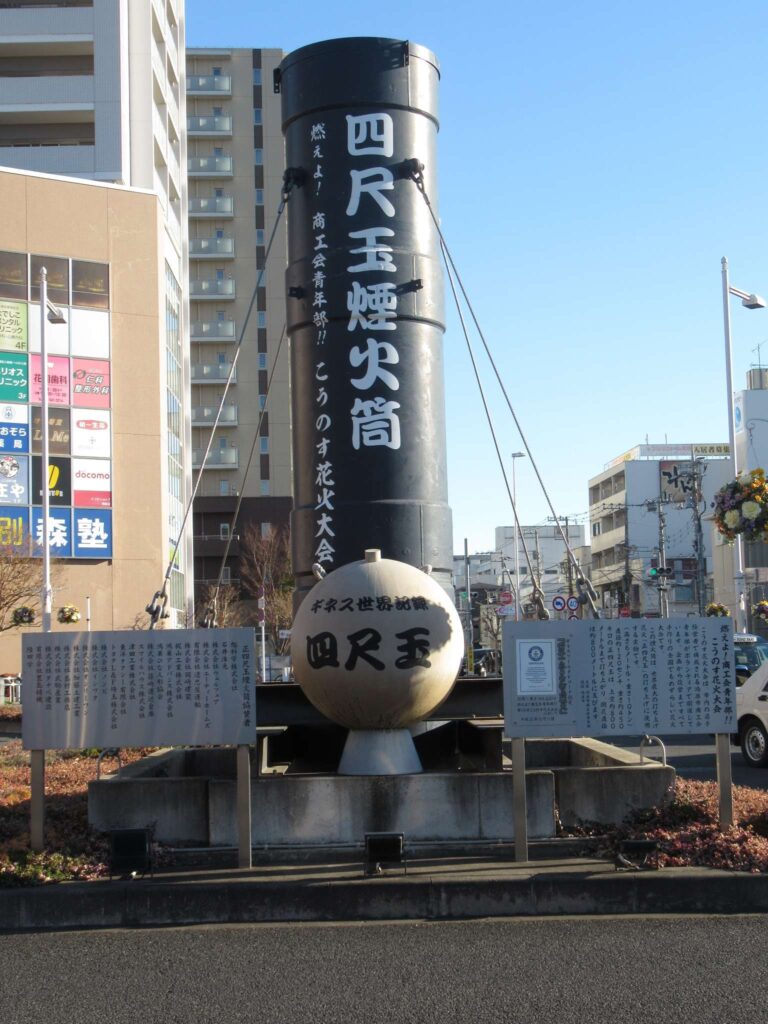 DoraNeko鴻巣駅東口ロータリーにある、四尺玉煙火筒モニュメントでございます。鴻巣市で開催される大規模なイベント、こうのす花火大会は有名なのでございます。傍らに四尺玉の実物大レプリカがありますが、やっぱデカいですな、そこの奥さん(←何処の奥さん?)。