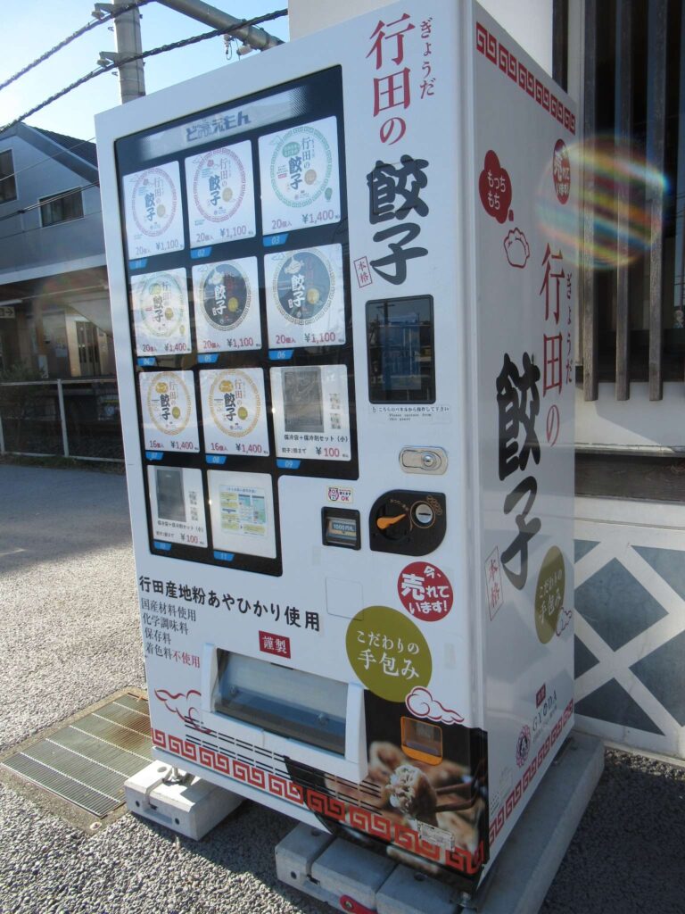 DoraNeko行田の餃子でございます。ダジャレでございます。しかしかかし単なるダジャレのウケ狙いだけではございません。行田おもてなし観光局、すなわち自治体が音頭を取って地元の食材で作り上げたものでございました。特に本来ウドンの粉だった行田産のあやひかりを使用したモチモチ食感、これが話題になって人気になったんですな。つい最近のことでございます。事の経緯や観光物産館で売っているのは知ってましたが、ど冷えモンの自販機まで出来ているとは思いませんでしたですよ、そこの奥さん(←何処の奥さん?)。