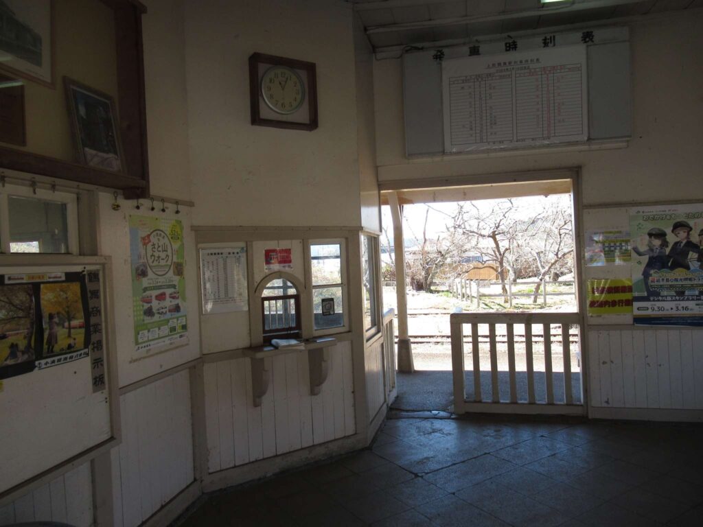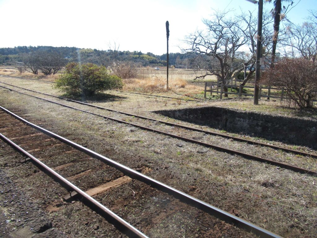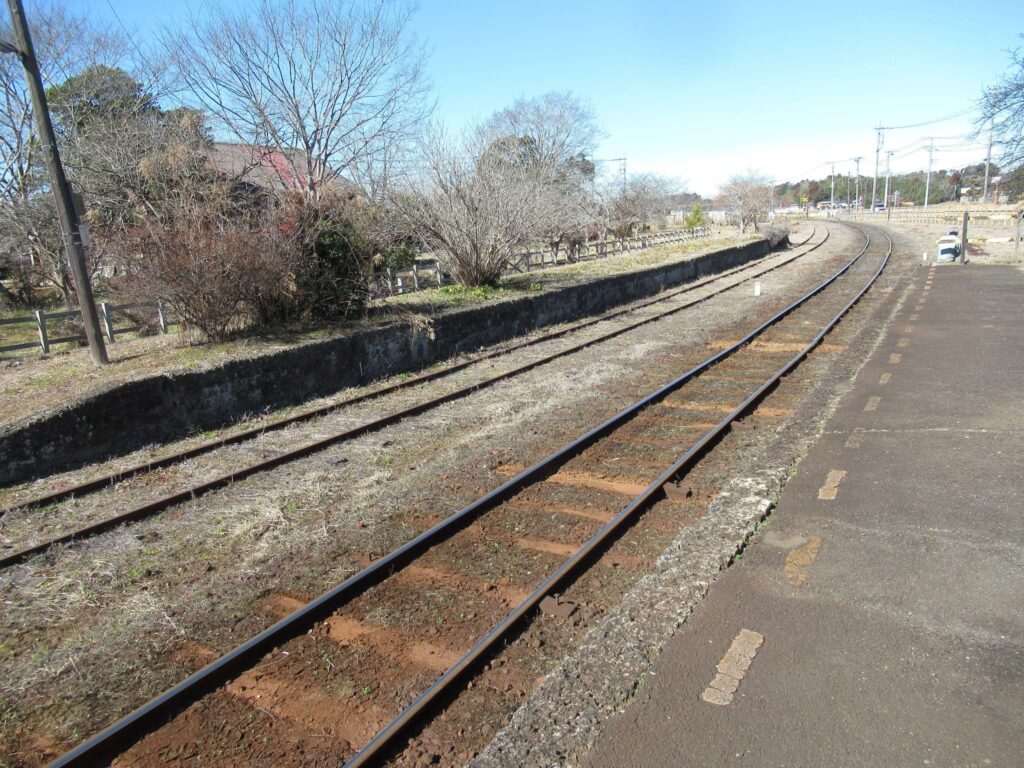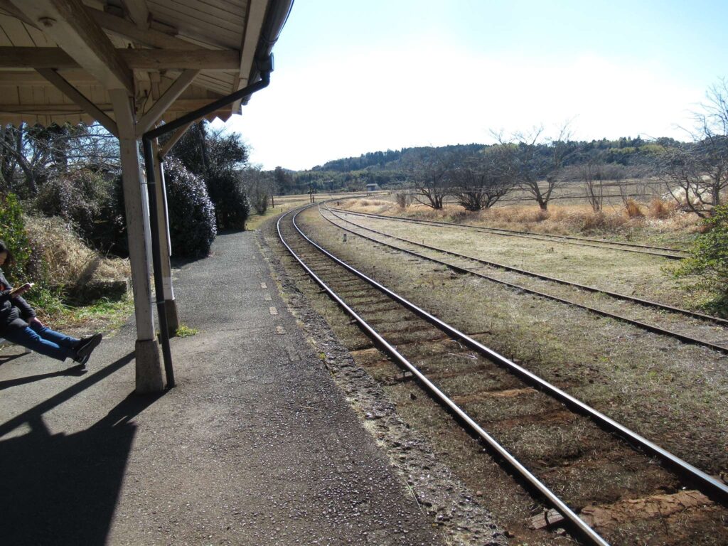 全線単線非電化の路線、小湊鉄道線の上総鶴舞駅でございます。単式島式複合型の2面3線だったうちの島式1面2線を廃止した単式1面1線の地上駅で、廃止されたホームと線路が残ったままになっております。国の登録有形文化財に登録されている開設当初からの古い木造平屋の駅舎がある無人駅でございます。映画やドラマ、PVといった映像作品のロケ地として、頻繁に使われている駅でございます。