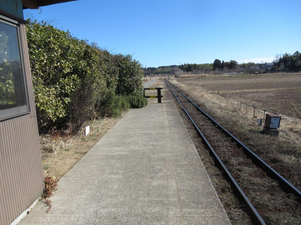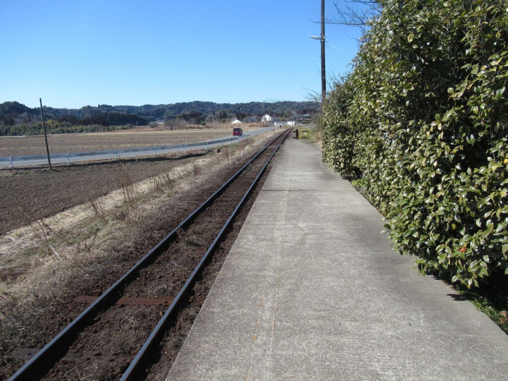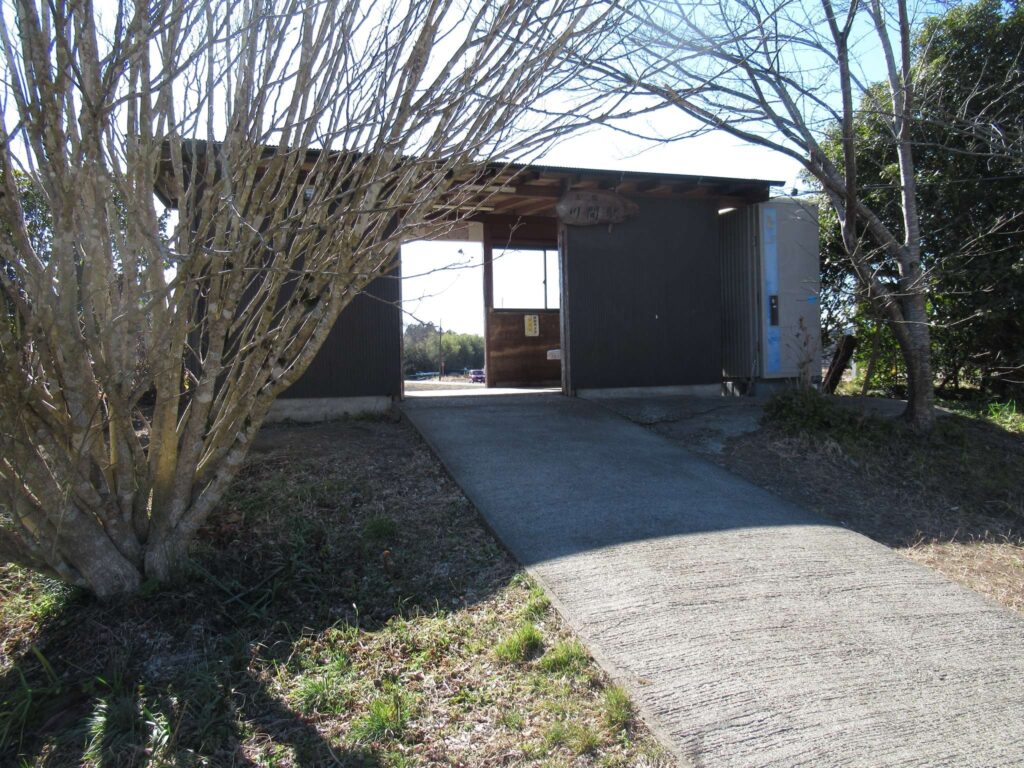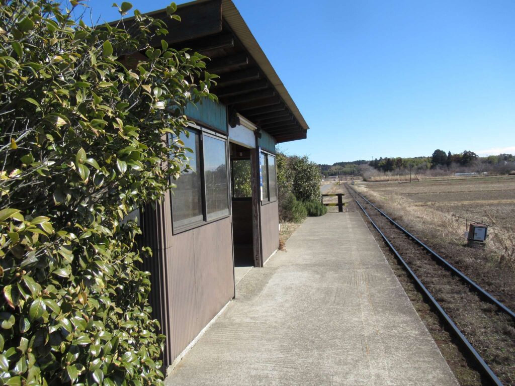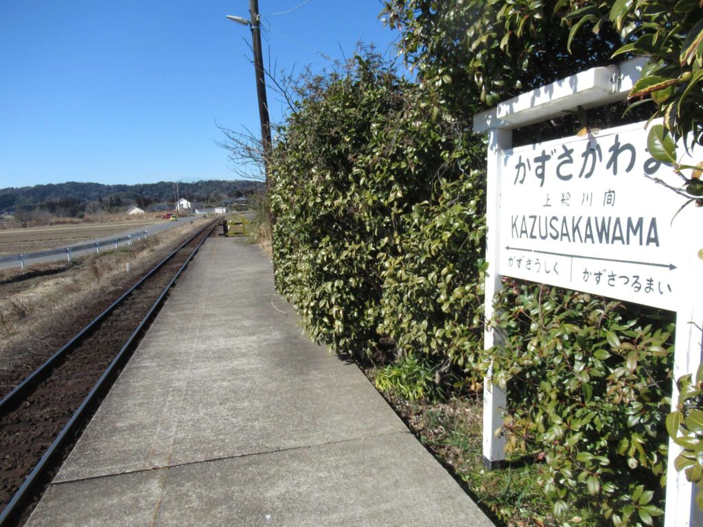 全線単線非電化の路線、小湊鉄道線の上総川間駅でございます。田園風景の中にある地上駅で単式1面1線の棒線駅となっております。待合室のみの簡易な駅舎のある無人駅でございます。