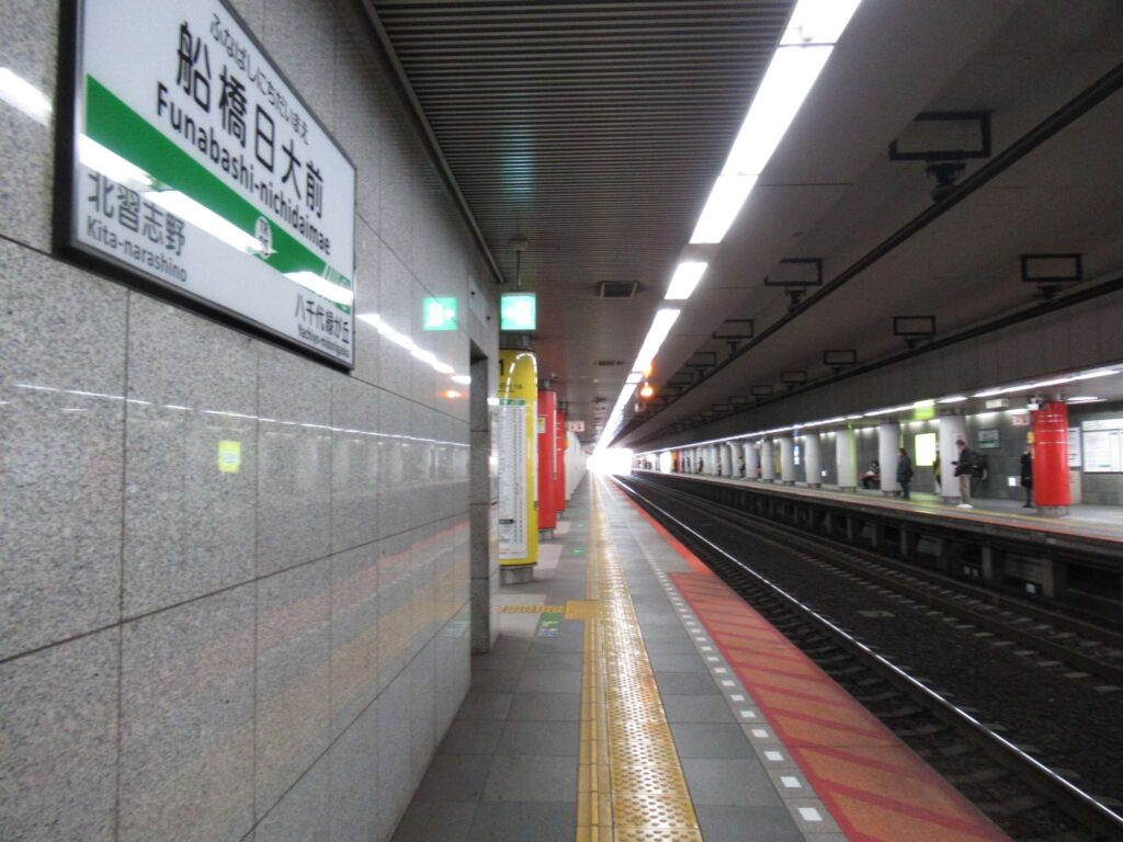 東京メトロ東西線に直通する第三セクター鉄道、東葉高速鉄道東葉高速線の船橋日大前駅でございます。複線電化区間にある相対式2面2線の地下駅となっております。東葉勝田台寄りはトンネルの出口となっており、ここから地上に顔を出し、高架となります。駅名の通り駅前に日本大学がある文教地区で、日本大学船橋キャンパス、日本大学習志野高等学校、千葉日本大学第一中学校・高等学校、東京動物専門学校などの最寄り駅となっております。