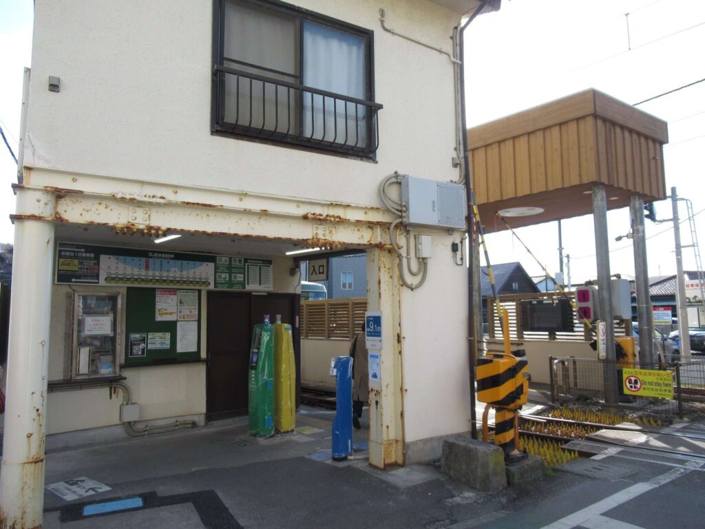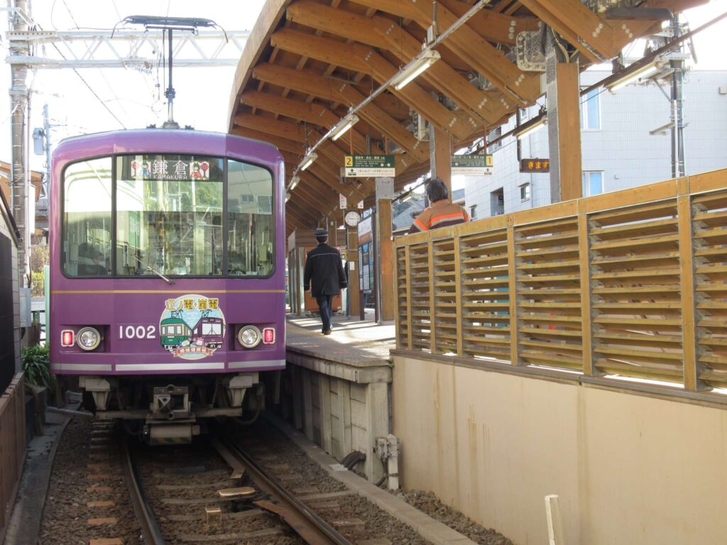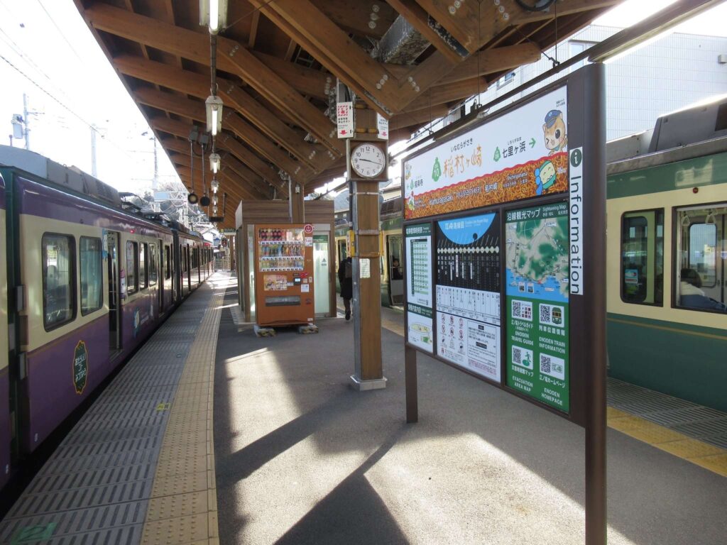 全線単線電化の路線、江ノ電こと江ノ島電鉄の稲村ヶ崎駅でございます。列車交換可能な島式1面2線の地上駅で、2階建て駅舎がございます。駅舎とホームは遮断機付きの構内踏切で連絡しております。