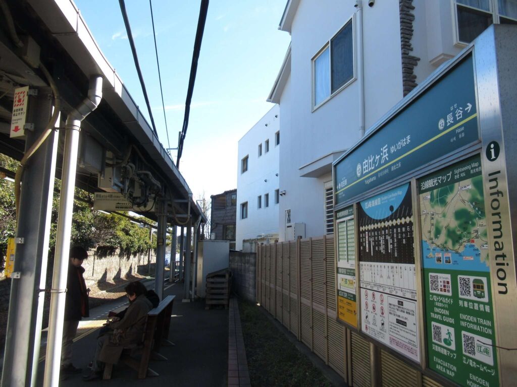 全線単線電化の路線、江ノ電こと江ノ島電鉄の由比ヶ浜駅でございます。地上駅で、単式1面1線の棒線駅となっております。簡易な駅舎のある無人駅で、屋根付きホーム上にベンチが設置されております。著名な海水浴場である由比ヶ浜海水浴場、材木座海水浴場などの最寄り駅となっております。