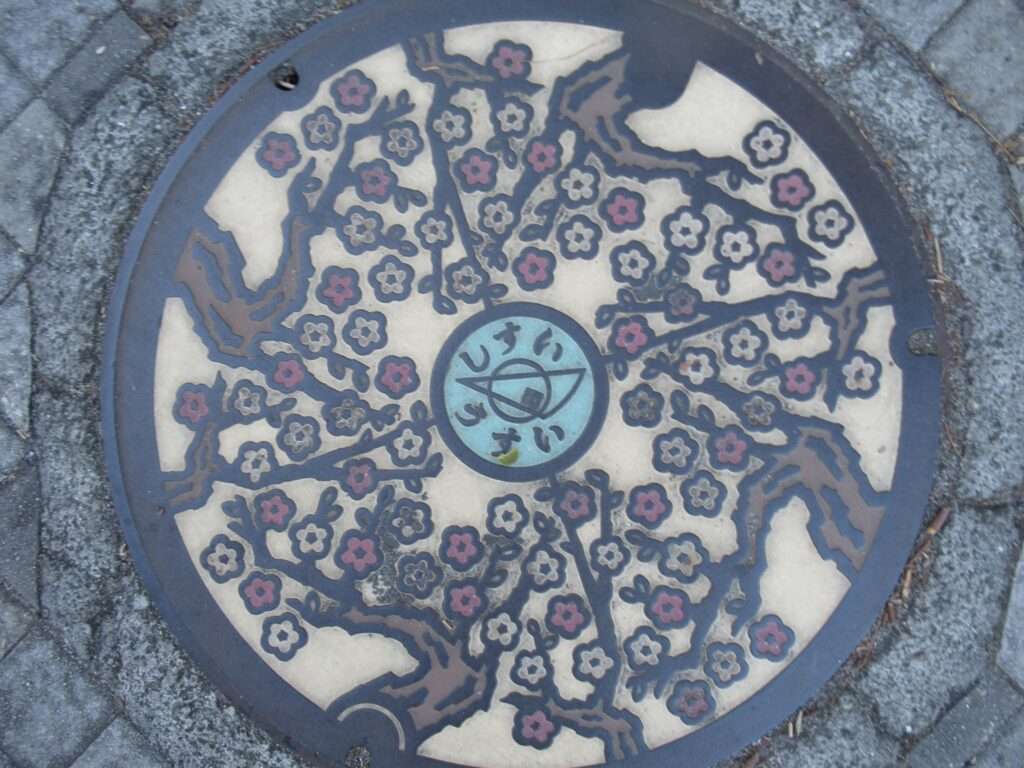 京成酒々井駅の東口にあった酒々井町のオリジナルデザインマンホール蓋でございます。酒々井町の木である梅が描かれております。