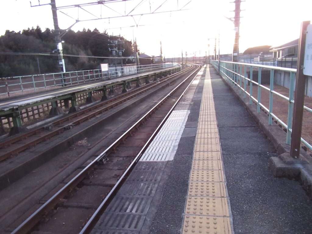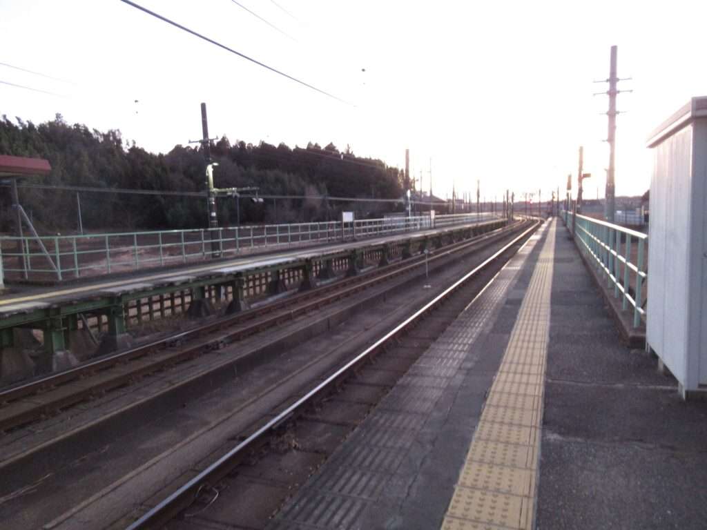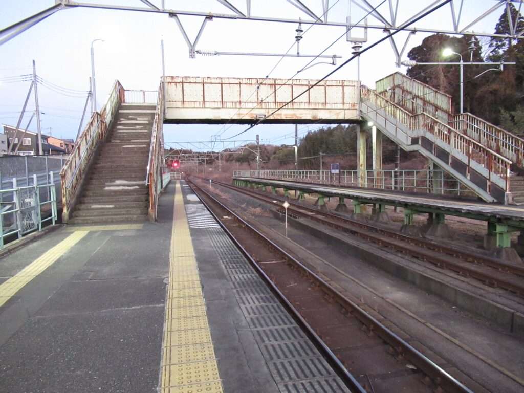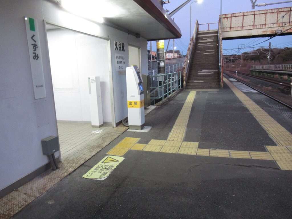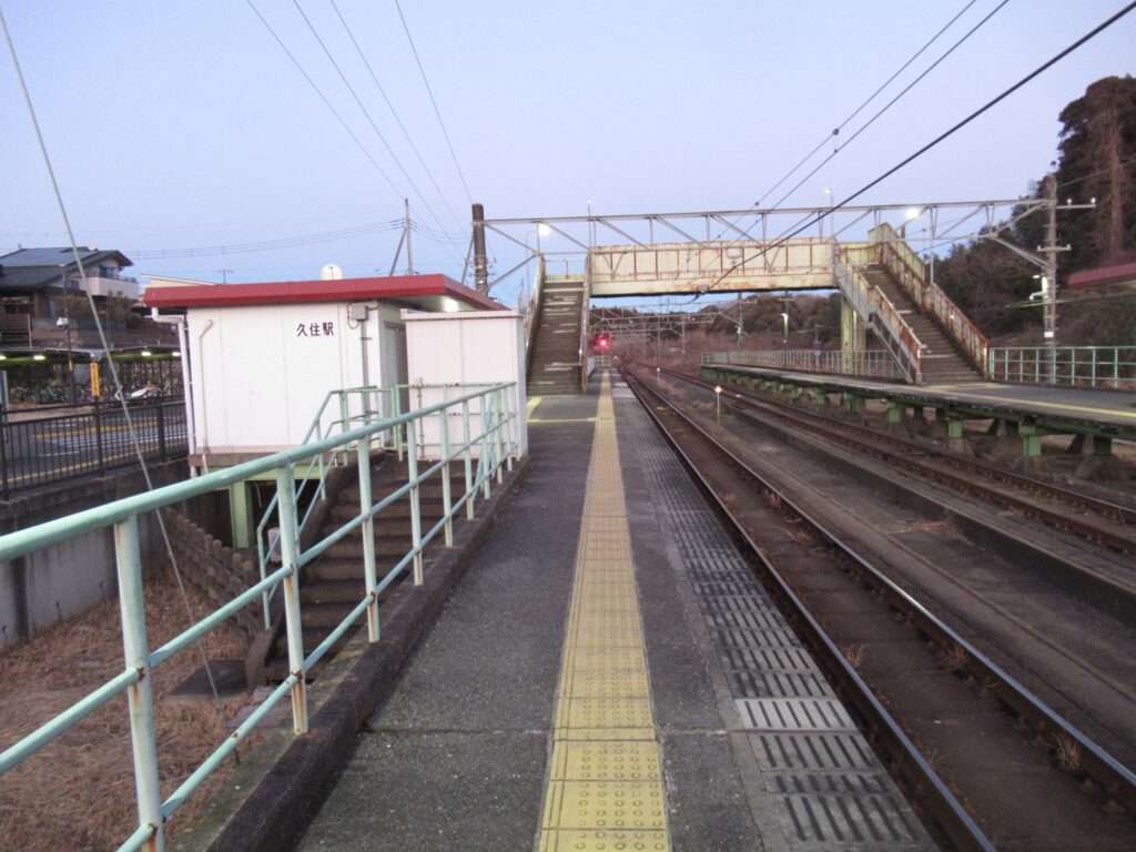 成田線の久住駅でございます。単線電化区間にある列車交換可能な相対式2面2線の地上駅で、平屋の駅舎がある無人駅となっております。ホーム間は跨線橋で連絡しております。