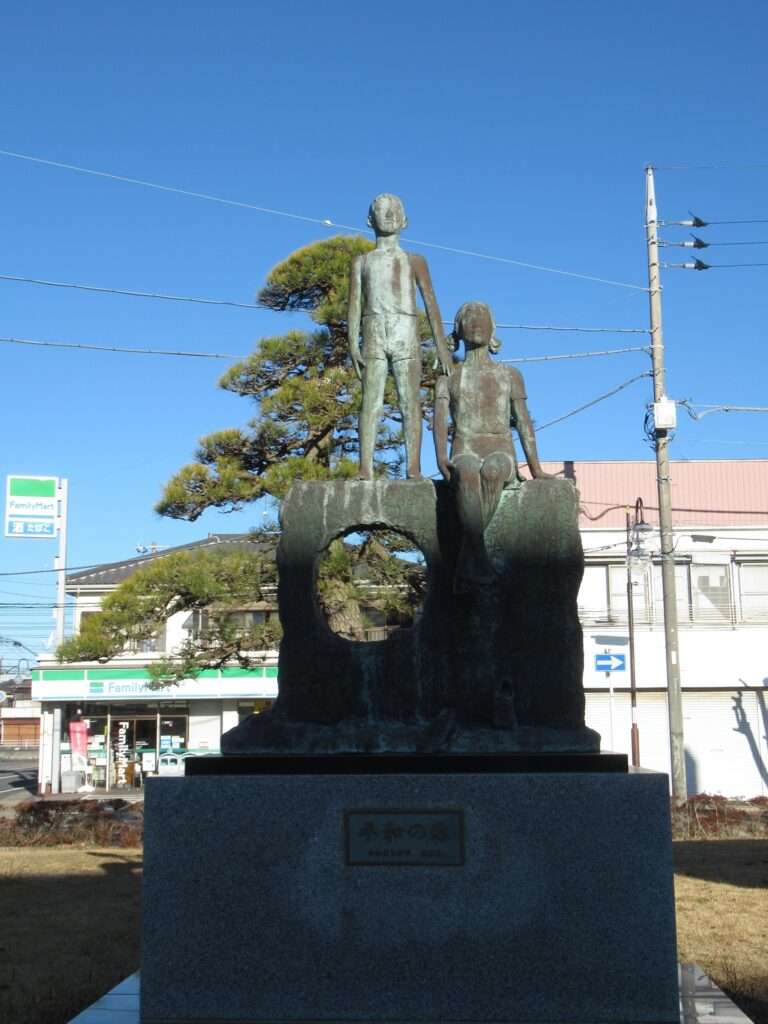 八日市場駅前の広場にある「平和の像」でございます。ここで平和祈念の折鶴を飾り、長崎などに贈る式典などが行われたりする場所なのだそうでございます。尊いですな。この広場が完成したのが、1989年(平成元年)のことらしいのですが、ワタクシこの八日市場にはそれより遥か昔、45年ほど前に度々来ております。某氏の自宅新築にかかわる仕事だったんですが、代金踏み倒しの被害に遭っておりましてですね、相当に嫌な思い&経験をしたのでございます。だから平和とは程遠いんですわ、そこの奥さん(←何処の奥さん?)。
