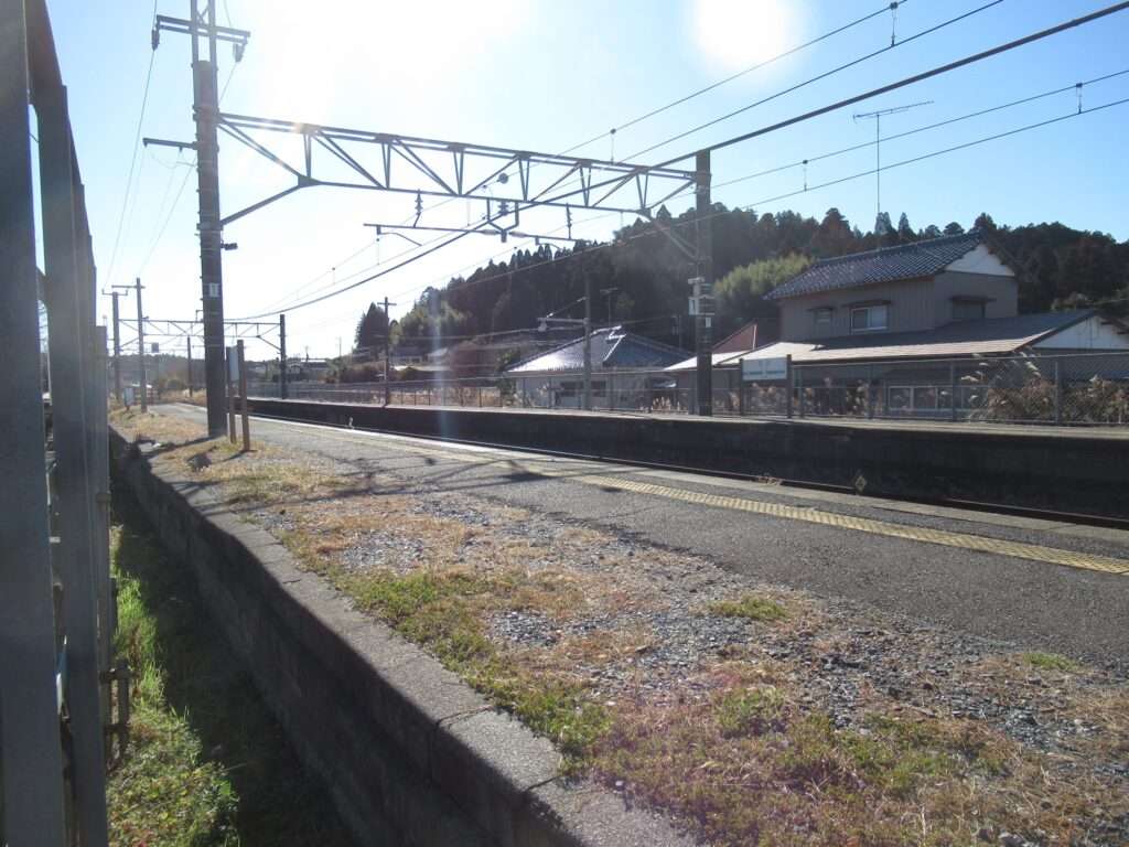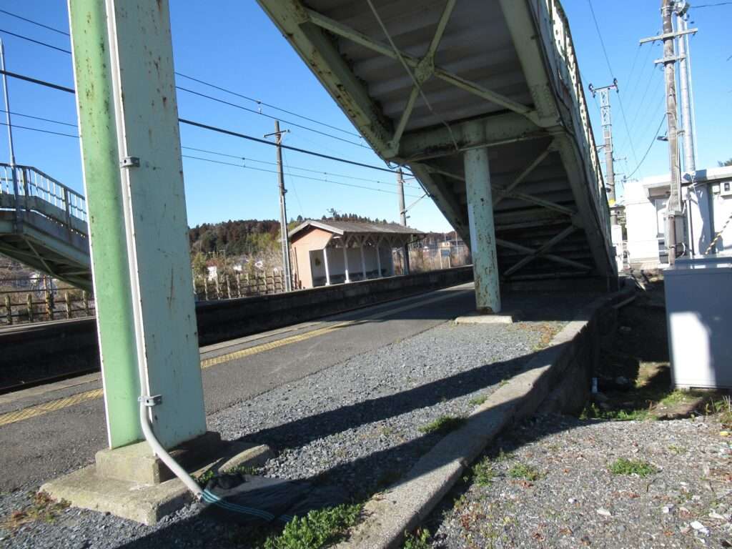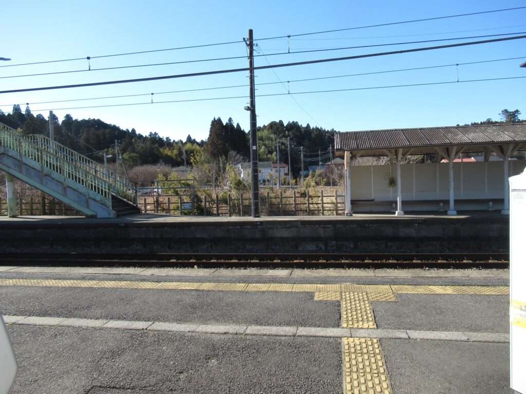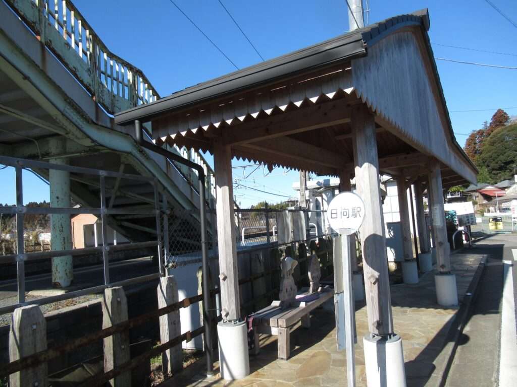 総武本線の日向駅でございます。単線電化区間にある列車交換可能な相対式2面2線の地上駅で、平屋の簡便な駅舎がある業務委託駅でございます。ホーム間は跨線橋で連絡しております。長閑な地域でございます。