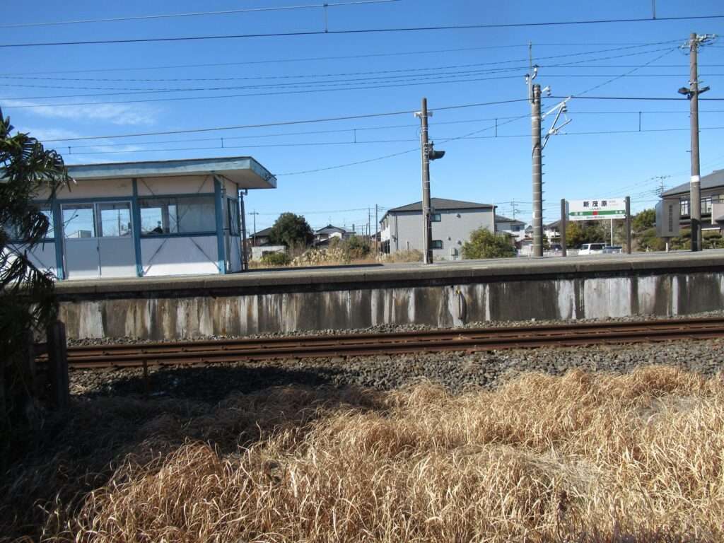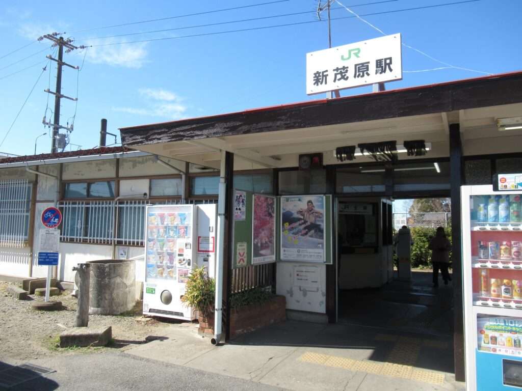 外房線の新茂原駅でございます。複線電化区間にある島式1面2線の地上駅で、平屋の駅舎がある業務委託駅となっております。駅舎からホームへは跨線橋で連絡しております。