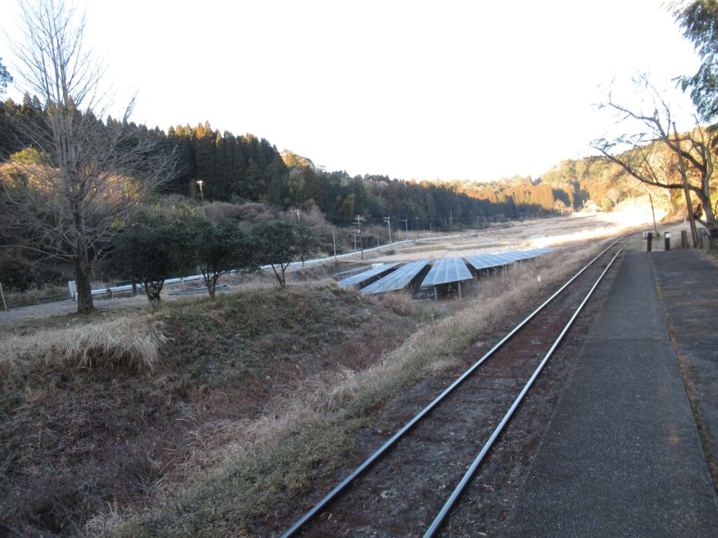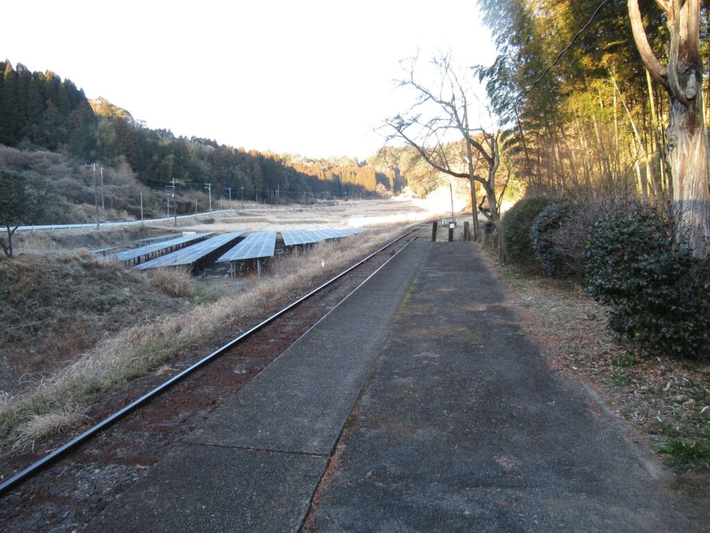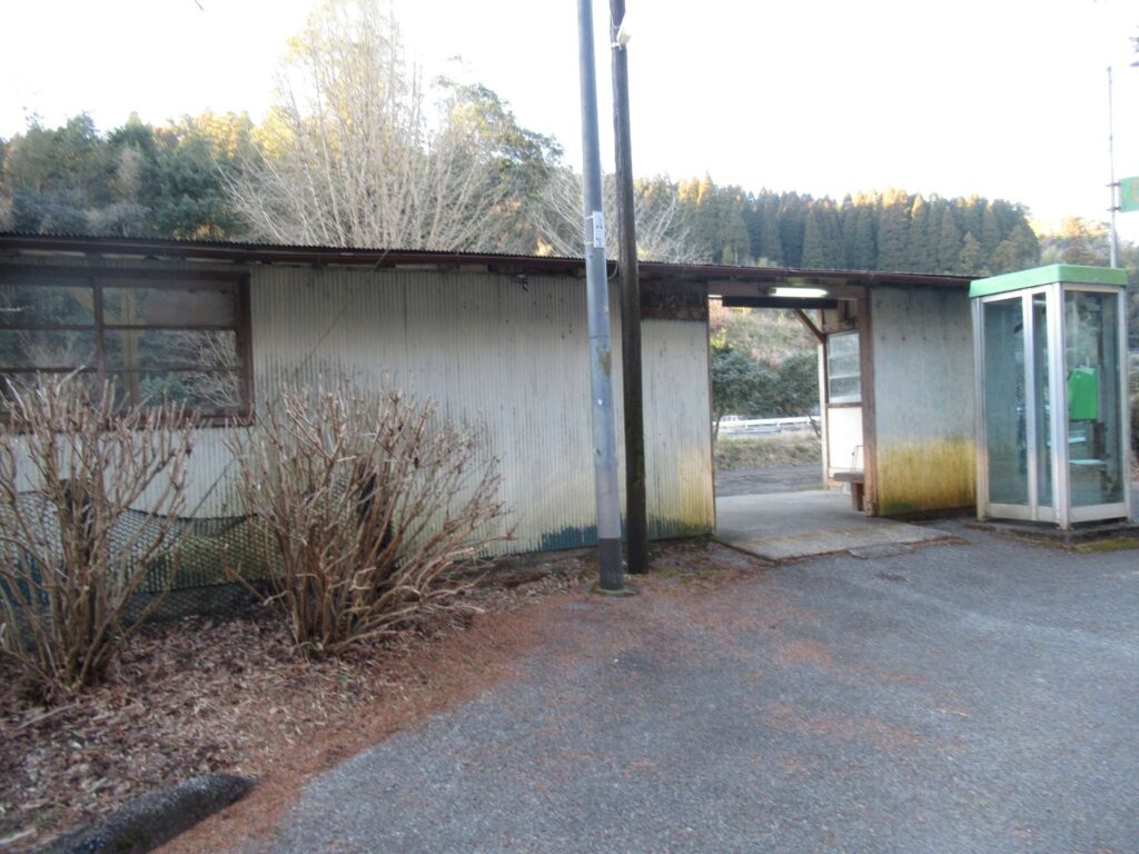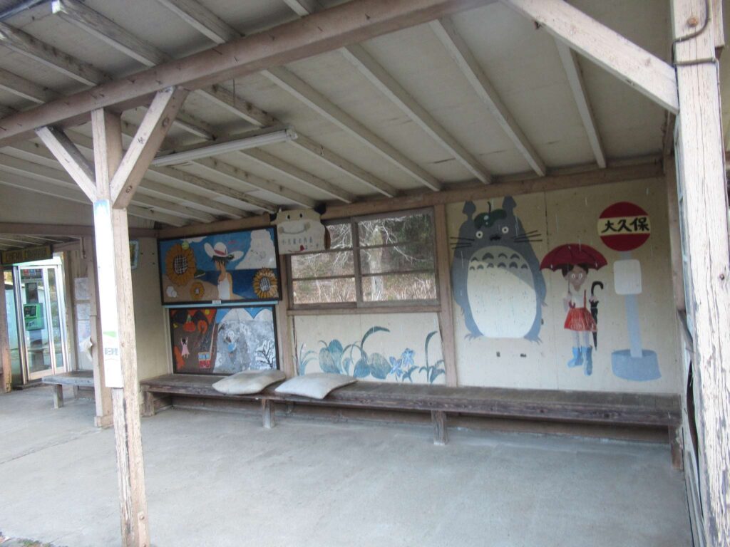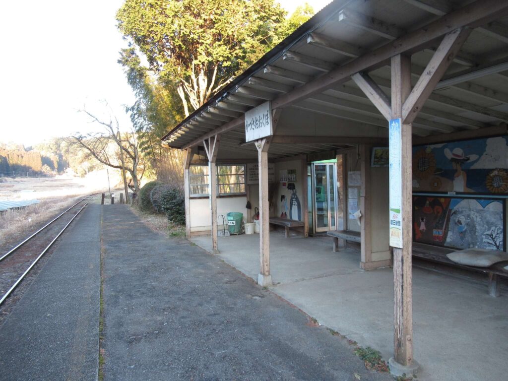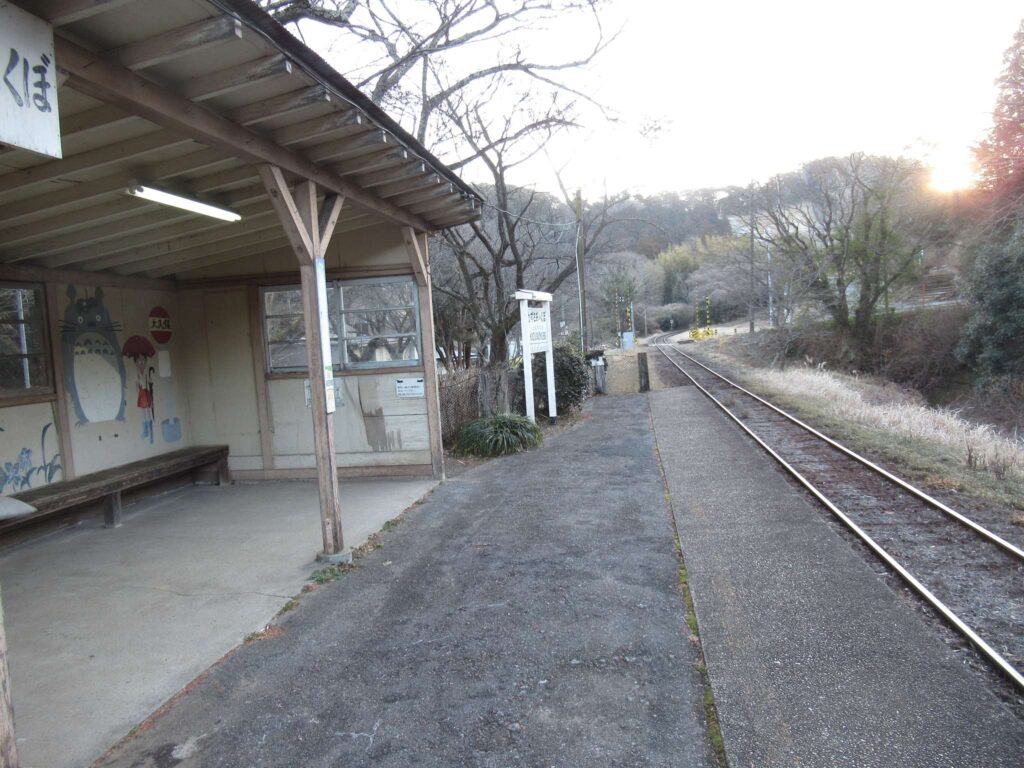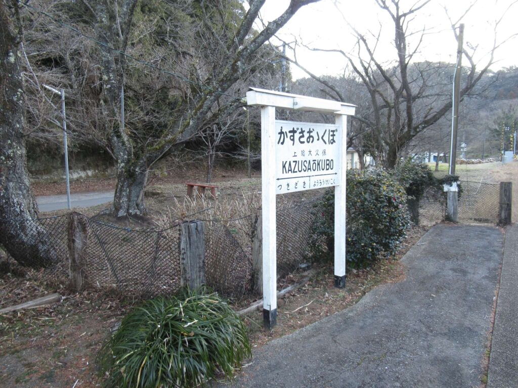 全線単線非電化の路線、小湊鉄道線の上総大久保駅でございます。地上駅で、単式1面1線の棒線駅となっております。駅舎のない無人駅で、ホーム上に待合所が設置されております。昔からある古いトイレの脇に、ARTプロジェクトとして新たに2014年(平成26年)に設置された「森の入口」と名付けられた公衆トイレがございます。