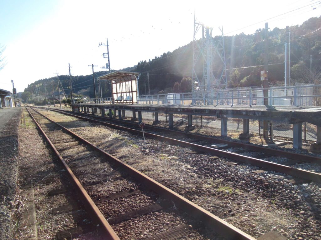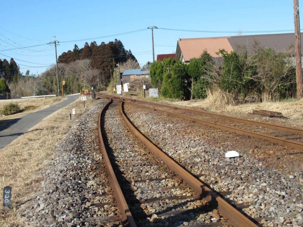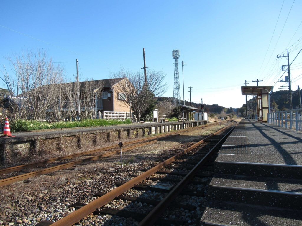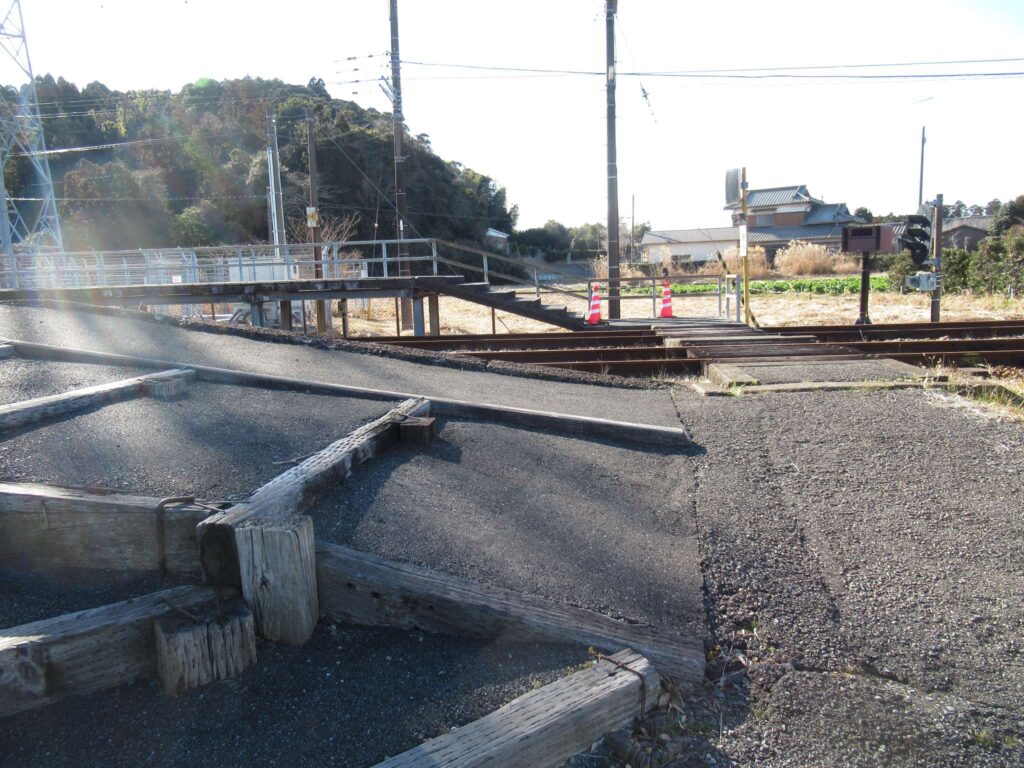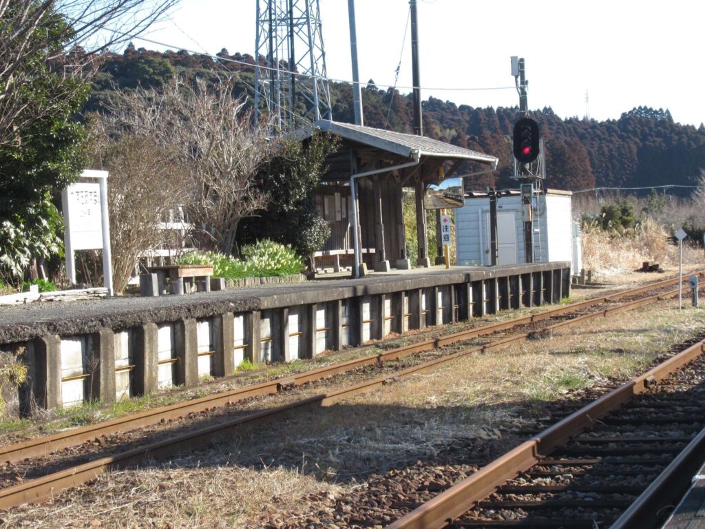 国鉄木原線を引き継いだ第三セクターで全線単線非電化の路線、いすみ鉄道いすみ線の上総東駅でございます。列車交換可能な相対式2面2線の地上駅で、駅舎のない無人駅となっております。両ホーム上に待合所が設置されております。ホーム間は遮断機付きの構内踏切で連絡しております。昨年の2024年(令和6年)10月に発生した保線不備による脱線事故のため現在は全線にわたり運休となっており、バスによる代行輸送が行われております。ワタクシの訪問時点および現在も、まだまだ再開の見通しが立たない状況が続いているのでございます。はてさてどうなりますことやら、ですな。