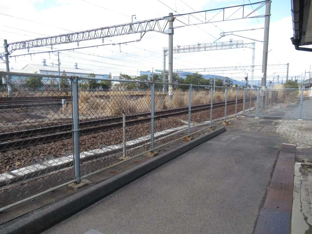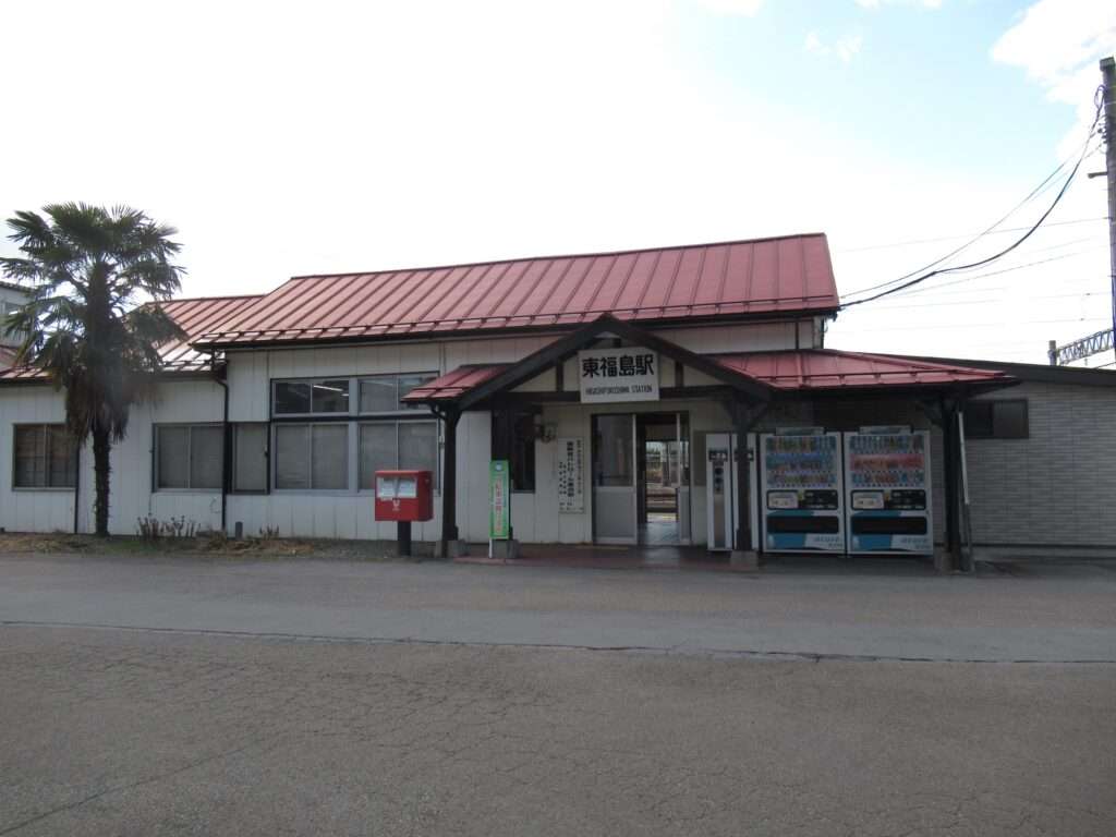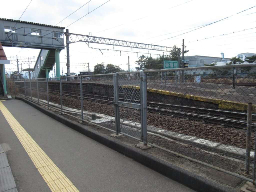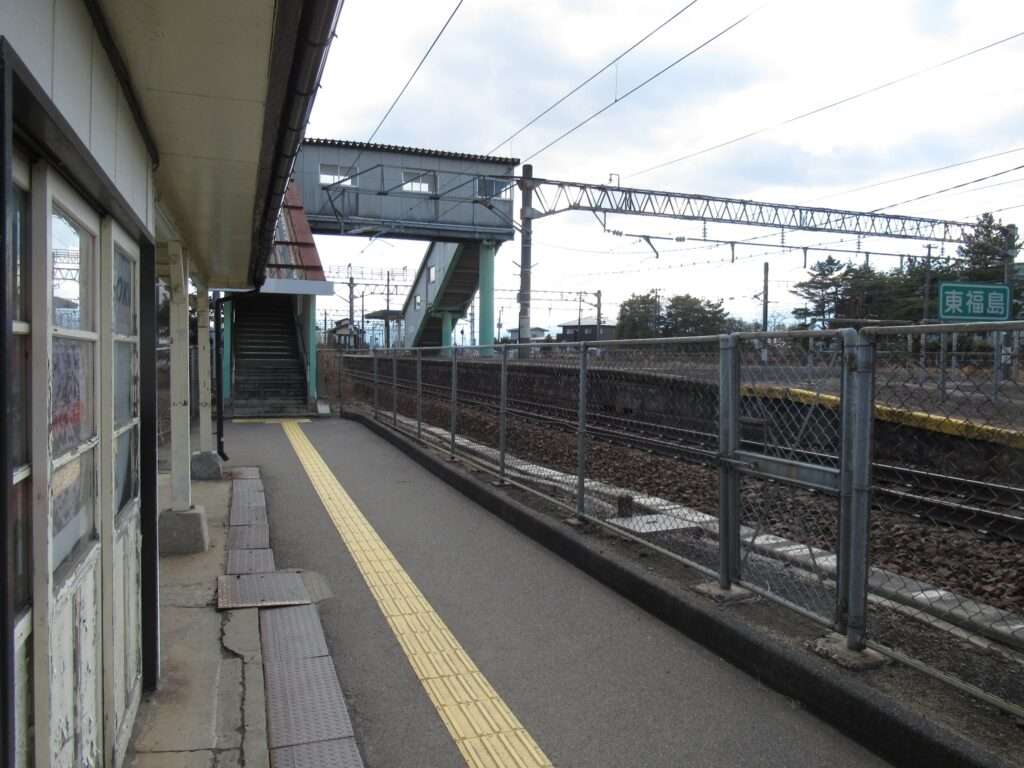 東北本線の東福島駅でございます。複線電化区間にある島式1面2線の地上駅で、ホームのない側線が2本ございます。平屋の駅舎がある業務委託駅で、駅舎からホームへは上屋付きの跨線橋で連絡しております。南側にJR貨物東福島駅・東福島オフレールステーションがございます。