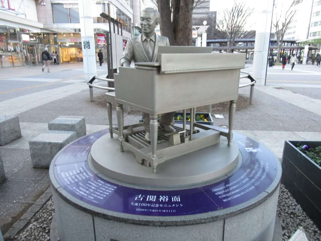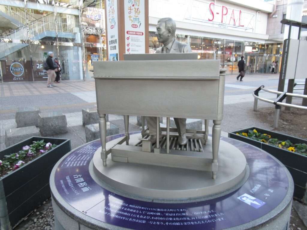 福島駅東口広場にある古関裕而生誕100年記念モニュメントでございます。阪神タイガースの球団歌「六甲おろし」、読売ジャイアンツの球団歌「闘魂こめて」、高校野球選手権大会の「栄冠は君に輝く」等々数多の曲を作曲した方でございますよ、そこの奥さん。