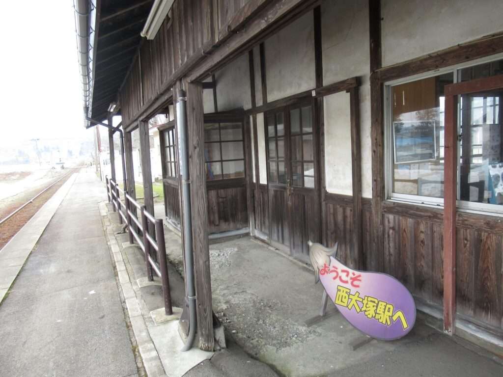 国鉄長井線を引き継いだ全線単線非電化の第三セクター路線、山形鉄道フラワー長井線の西大塚駅でございます。登録有形文化財に指定されている古い木造平屋の駅舎が残っている無人駅の地上駅で、単式1面1線の棒線駅となっております。