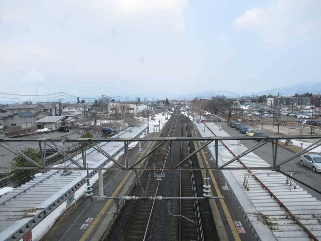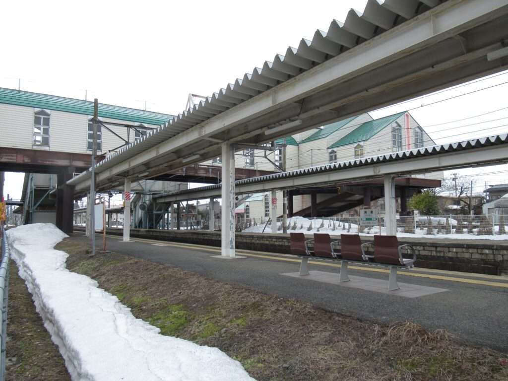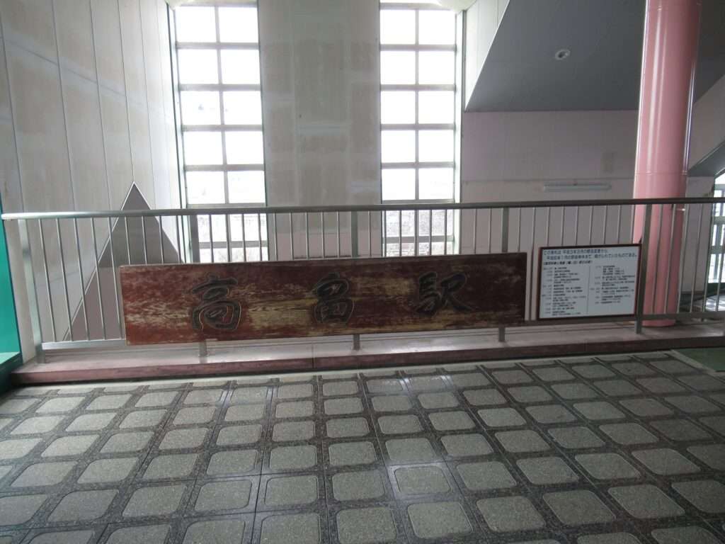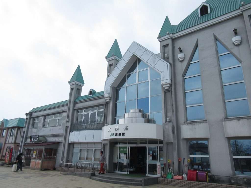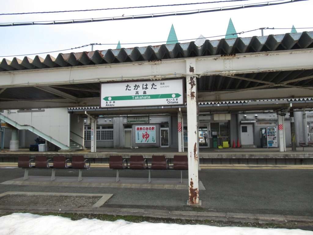奥羽本線の高畠駅でございます。「山形線」の愛称区間に含まれております。ミニ新幹線である山形新幹線が走行する単線電化区間にある相対式2面2線の地上駅で、山形新幹線の列車の約半数が停車いたします。駅舎は日本のアンデルセンと称された童話作家の浜田広介の出身地であることにちなんだメルヘン調の立派な建物で、温泉施設である高畠町太陽館が併設されております。駅舎とホームは上屋付きの跨線橋で連絡しており、更にそれとは別の自由通路の跨線橋が設置されております。山形県立高畠高等学校、浜田広介記念館などの最寄り駅となっております。