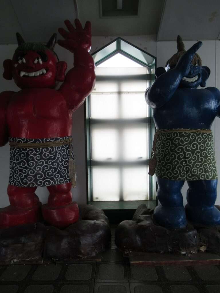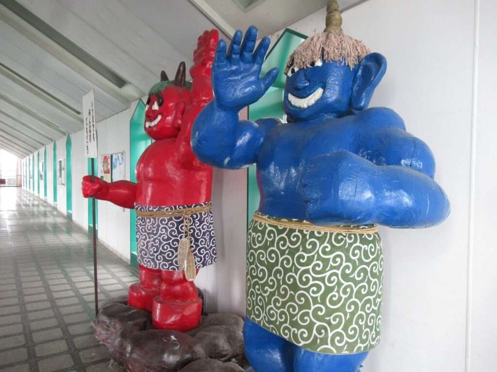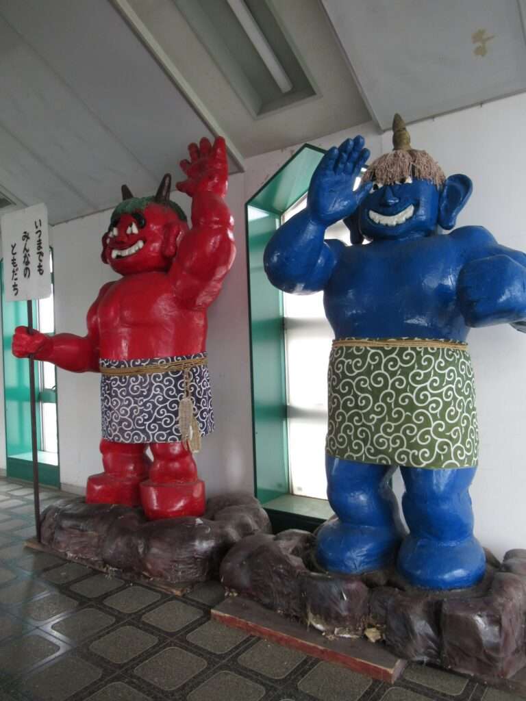 高畠駅の自由通路の跨線橋、通路内に設置されている赤鬼と青鬼の像でございます。日本のアンデルセンと称された童話作家の浜田広介の出身地であることから作品「泣いた赤鬼」に因んでここに置かれているものなのだそうですよ、そこの奥さん(←何処の奥さん?)。